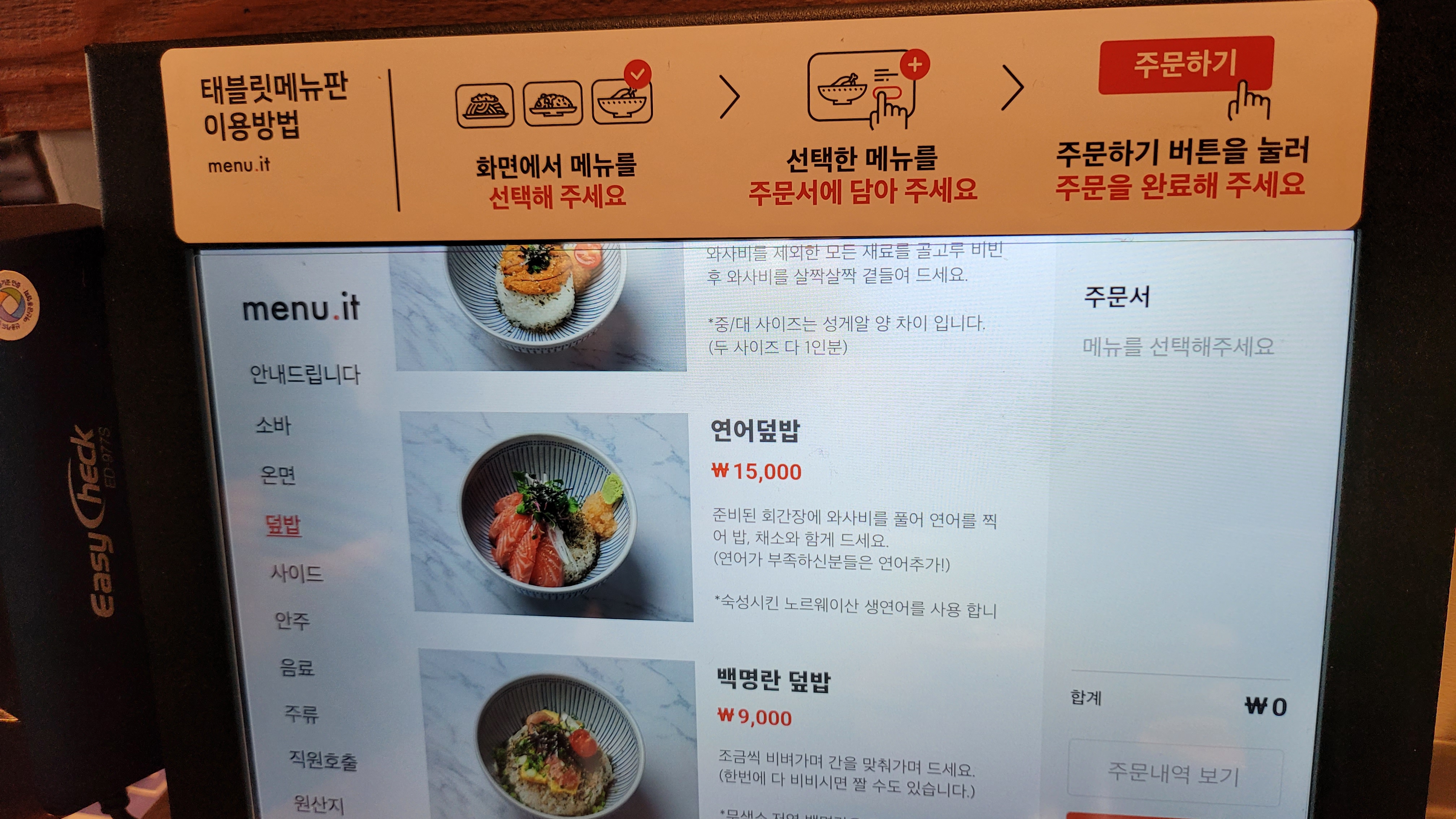 저는 왼쪽에 있는 세로 사이드바에서 덮밥을 선택하고, 백명한 덮밥을 주문 카트에 담았습니다.