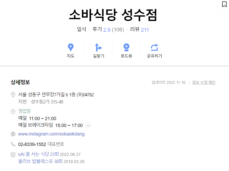 소바식당 공식 인스타그램으로 접속하시면 다양한 메뉴들을 만나보실 수 있습니다. 평소 웨이팅이 있는 편인데 기다리면서 뭐 먹을지 골라 보는 재미가 있을 것 같습니다. 요즘 MZ 세대들은 사업장의 인스타그램 같은 걸 보면서 정보를 많이 얻고 있는데요. 특별하게 관리하지 않더라도 여기 소바식당 같은 경우를 참고하시면 좋을 것 같습니다. 많은 사람들이 궁금해하는 건 어떤 메뉴가 있는지, 가격은 어떻게 되는지 등 등 이 정도 정보만 제공해도 충분하지 않을까 생각해 봅니다. 아래 이미지처럼 포털 사이트에서 검색하면 주소나 메뉴만 있는 경우보다 인스타그램 주소 링크가 있으면 한 번이라도 더 검색에 노출되지 않을까요?^^