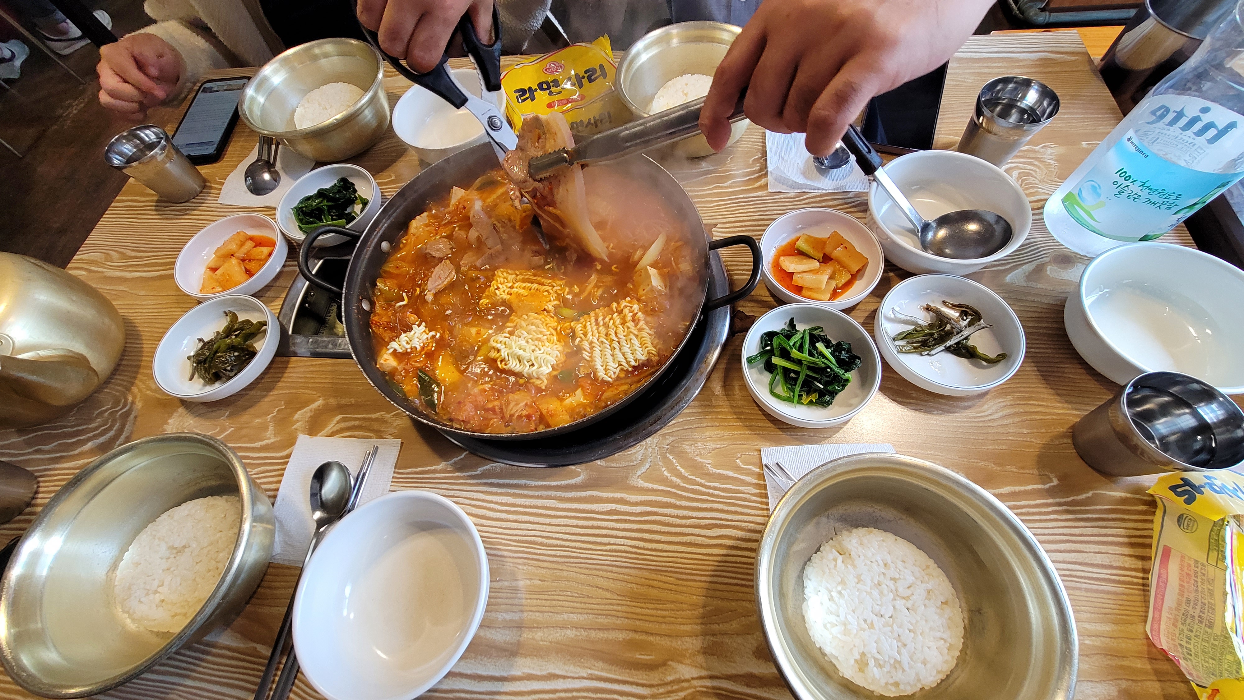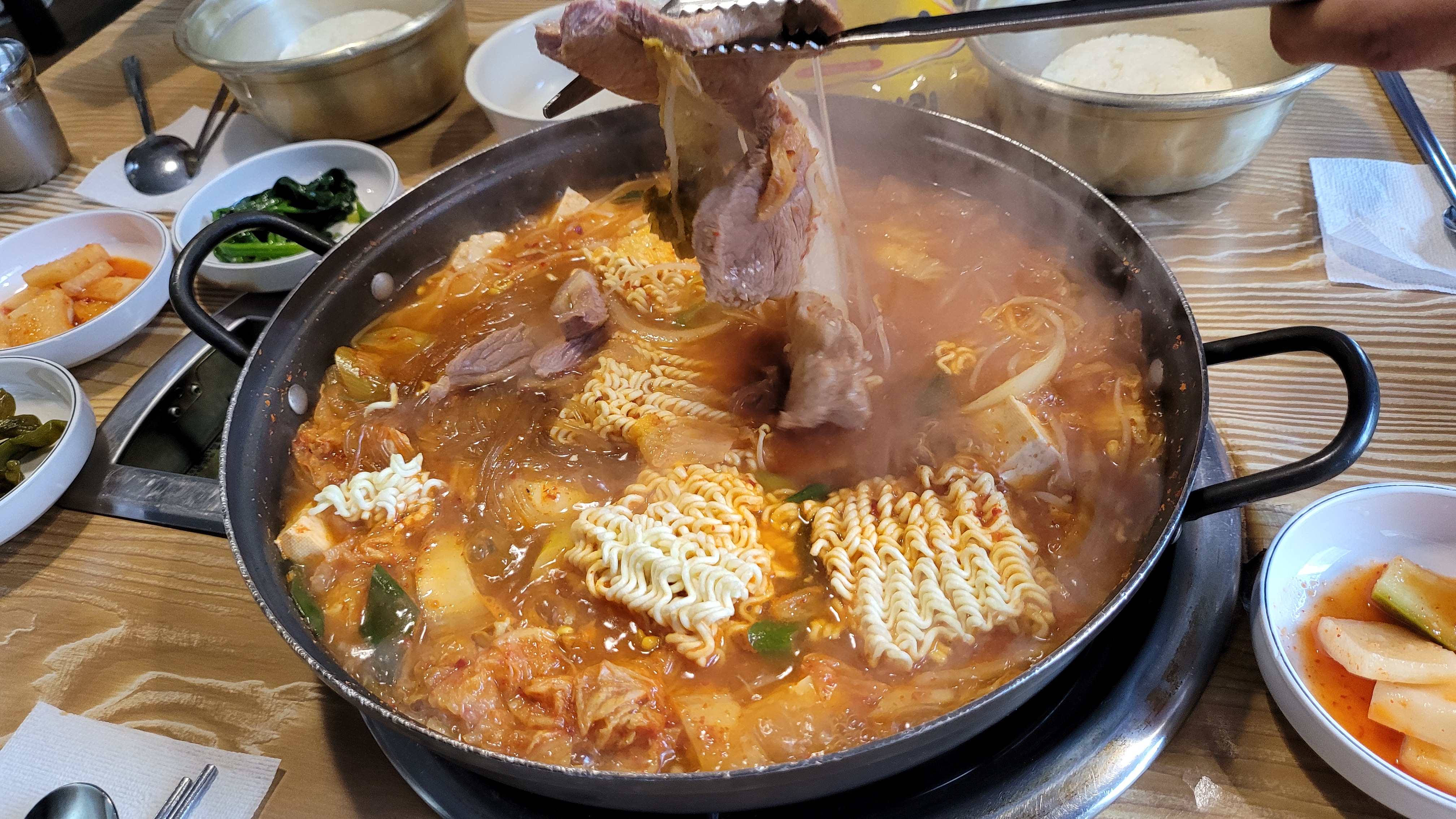 1인분에 9,000원! 생고기 김치찌개입니다. 4명이 갔는데 라면사리도 2개 주문했습니다. 저 큼직한 생고기가 통으로 들어 있어요. 국물이 굉장히 진하고 깊어서 엄마가 끓여주던 그런 김치찌개 맛이 납니다. 양이 제법 많아서 성인 남성 4명이 먹어도 늘 남습니다. 제공되는 그릇에 두 번 정도는 가득히 담아도 남더라고요.