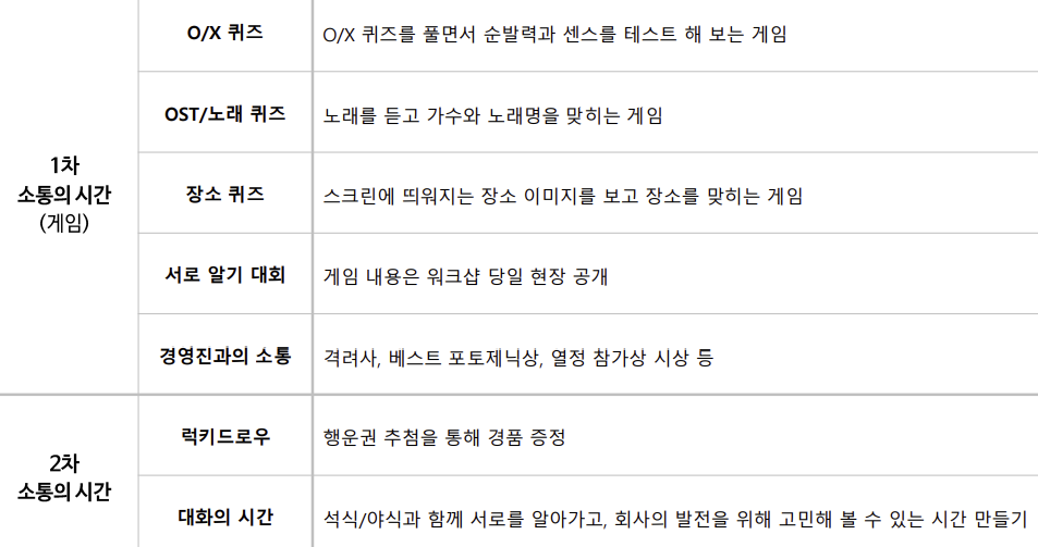 - 게임 : 족구, O/X 퀴즈, 인물/관광명소 사진 보고 알아맞히기 퀴즈, 노래/OST 맞추기 퀴즈, 서로 알기 게임(회사 근처 자주 가는 맛집?, 당신의 혈액형은?, 당신의 입사 연도는? 등 3가지의 질문을 칠판에 적고, 미리 준비한 워크숍 참석자 명단에 선착순 5명을 채워오는 게임 ★ 이 게임하면서 모르는 사람 인사도 하고 매우 반응이 좋았습니다) 장소는 아래 교육장인데요. 명칭은 세미나실입니다. 별도 대여비 발생.