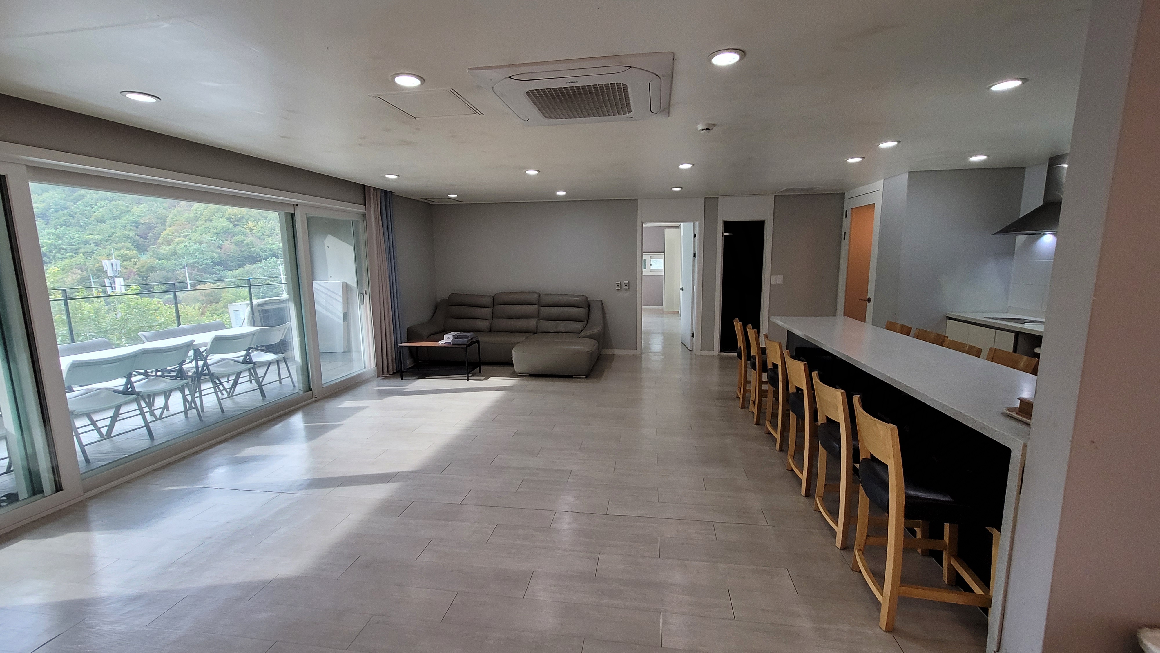 60평 규모의 501호입니다. 저녁 식사가 끝나면 2차가 진행될 장소인데요. 큰 방이 양쪽으로 2개 있는데, 굉장히 넓고 쾌적합니다. 저희 다섯가족이 여기 오면 충분할 정도가 아니라 남을 것 같더라고요. 두 가족, 아니 세 가족도 가능할 것 같습니다. 참고로 501호는 최대 20명이 숙박을 할 수 있는 곳입니다. 저희는 5동 건물을 통째로 대여했고, 당일치기를 허용했기 때문에 전체 참여 인원의 약 50%인 25명 정도만 1박을 해서 공간 상으로 꽤 여유 있었습니다. 밤 9시를 기준으로 남아 있는 사람들을 취침 인원으로 카운팅 하기 때문에 예산 내에서 비용을 집행해야 하는 제 입장에서는 당일치기를 암묵적으로 허용하고 있었는지도 모르겠습니다^^;;;