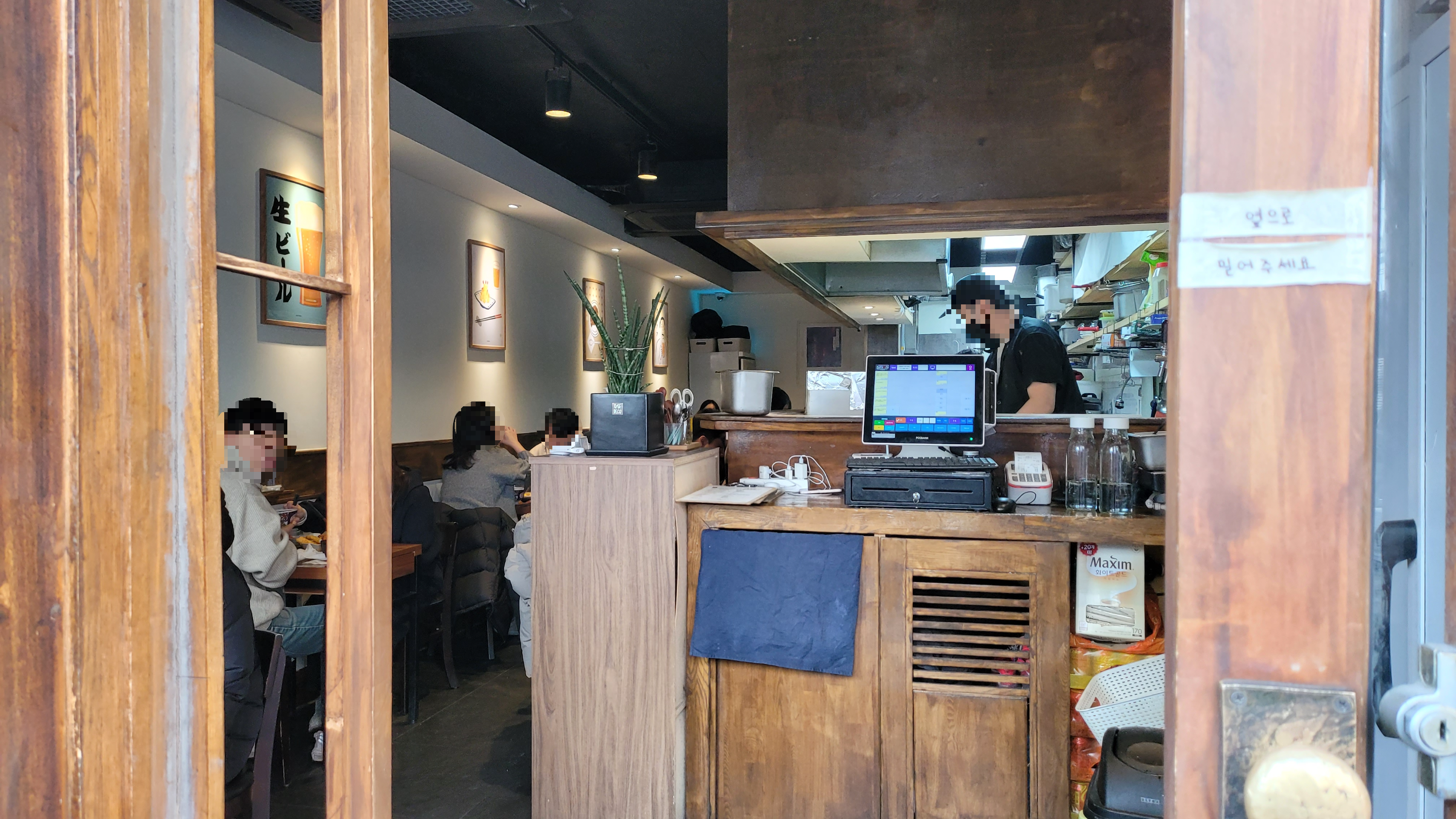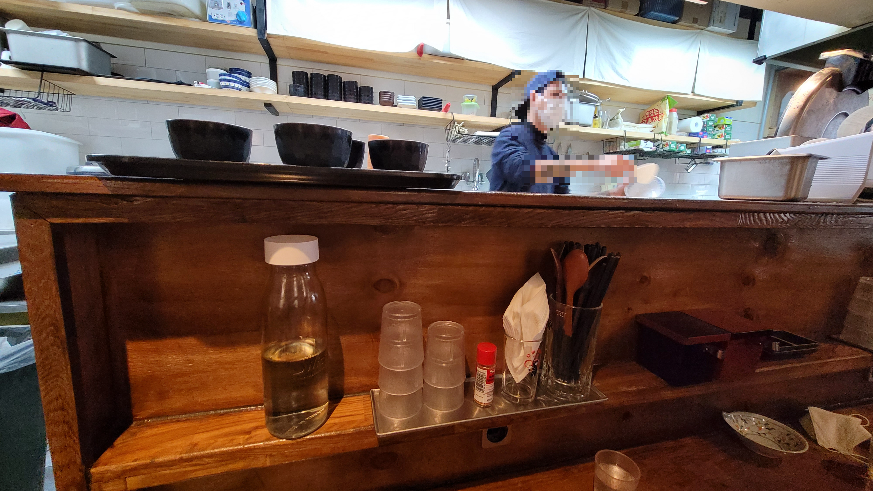 자세히 보시면 물컵 아래에 전기 콘센트가 있는데요. 여기가 원래 커피숍이 아니었을까 라는 생각을 해봤습니다. 키친이 이렇게 오픈되어 있기 때문에 '청결'은 기본이겠다는 생각이 들었고, 내가 주문한 음식이 조리되는 걸 느껴볼 수 있어 좋았습니다. 젓가락과 숟가락이 나무로 되어 있고, 단무지와 생강 통, 그리고 후추가 놓여 있습니다.