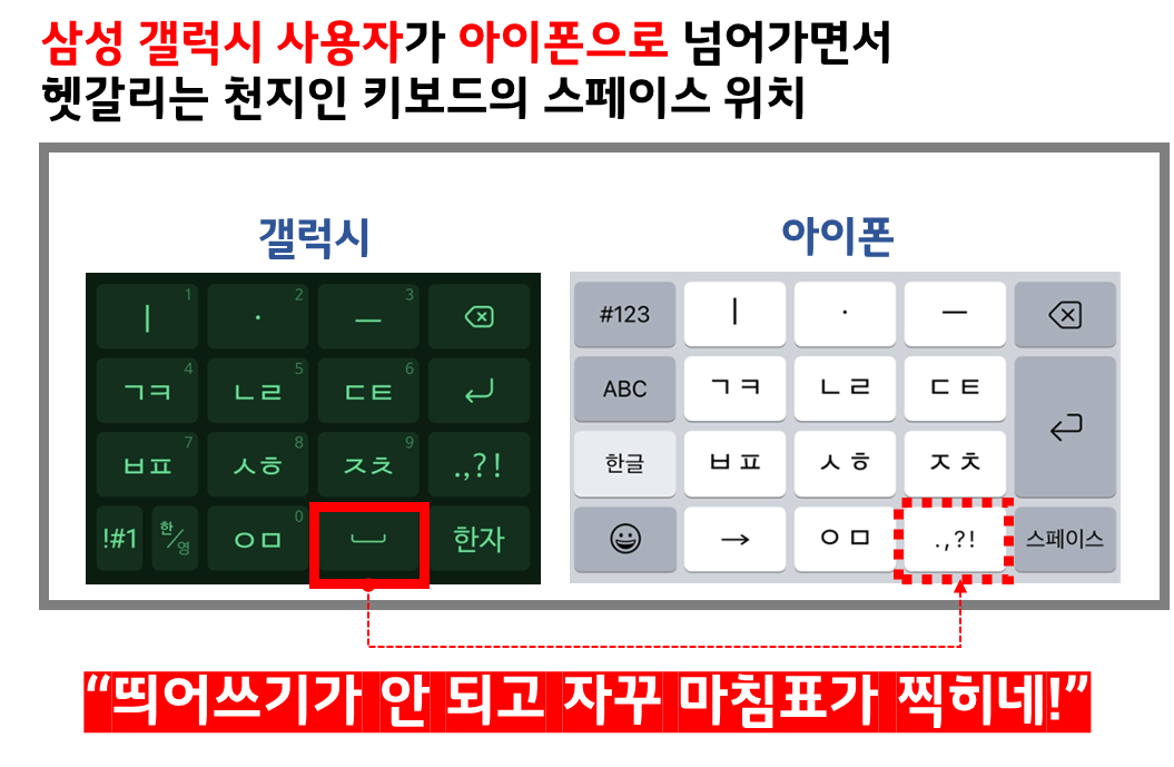 우선 천지인 키보드에서 갤럭시와 아이폰의 경우 띄어쓰기를 사용하는 '스페이스'의 위치가 달라 헷갈리더라고요.