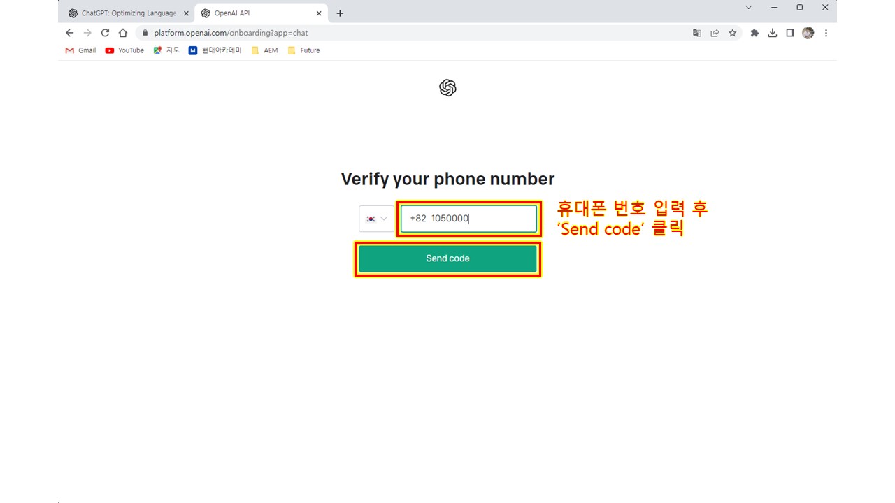 핸드폰 번호를 입력하고 'Send code'를 클릭하여 인증 코드를 요청합니다.