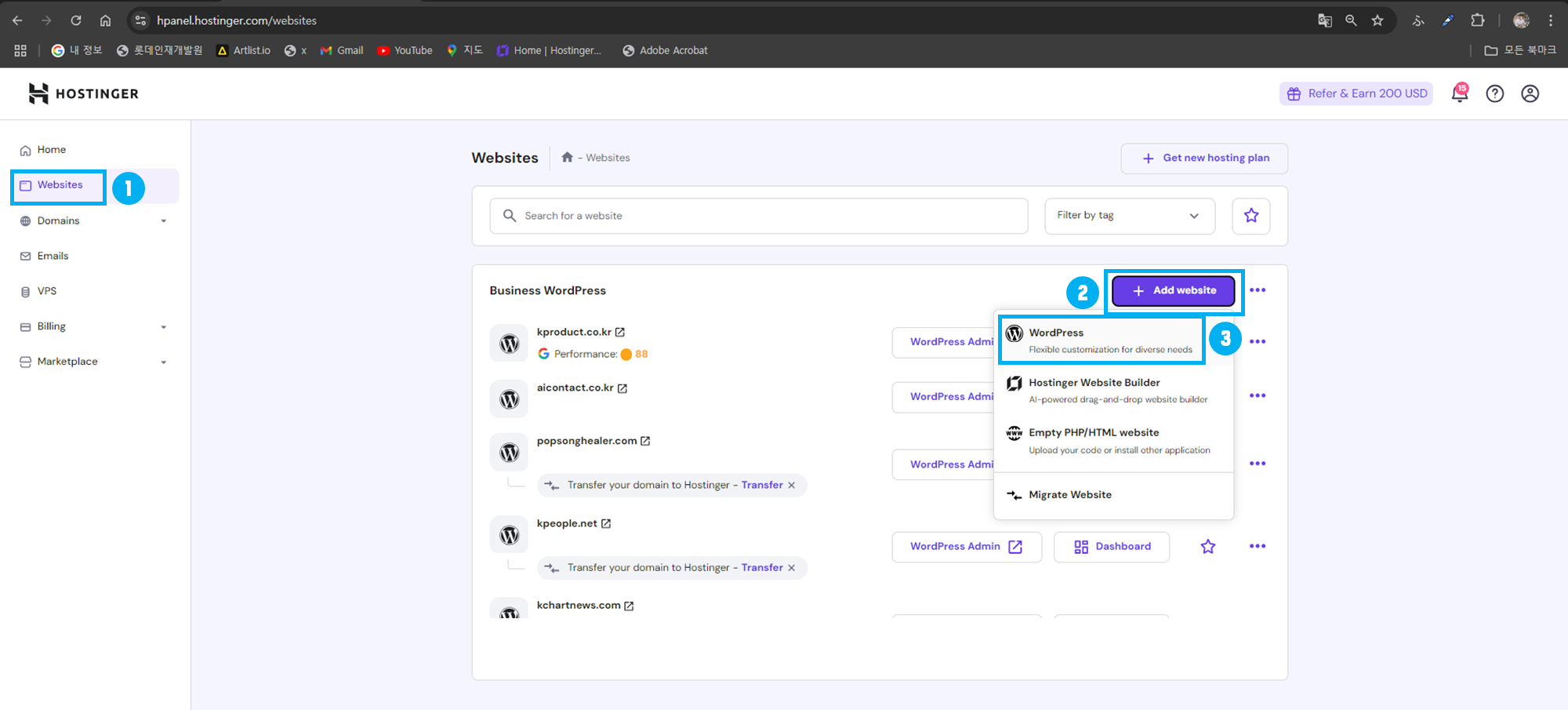① 호스팅어 가입 후 웹사이트 관리 메뉴로 오셔서 "Website" 클릭