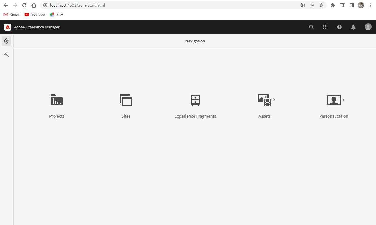 내 로컬에 AEM클라우드 설치 후 접속 화면으로 실제 프로젝트 시 구축한 AEM 접속화면과 동일함