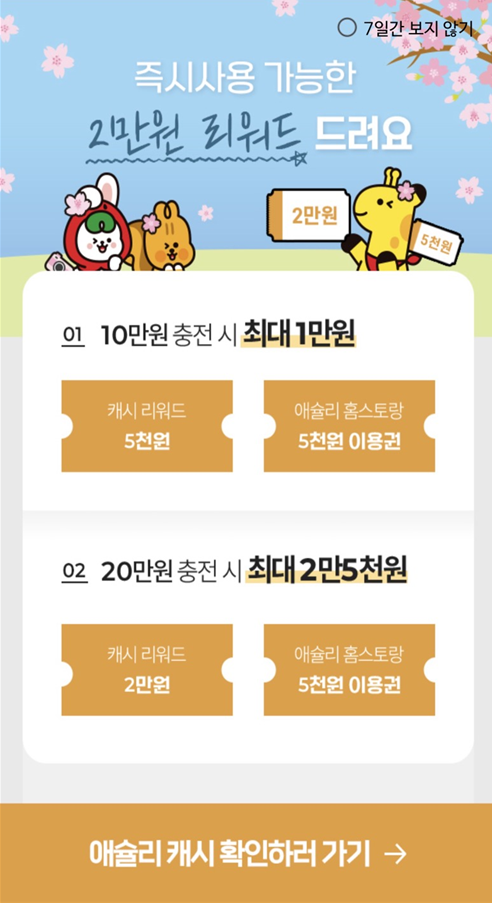 > 20만원 충전 시, 20만원 캐시 + 2만원 캐시 증정 → 총 10% 할인 효과