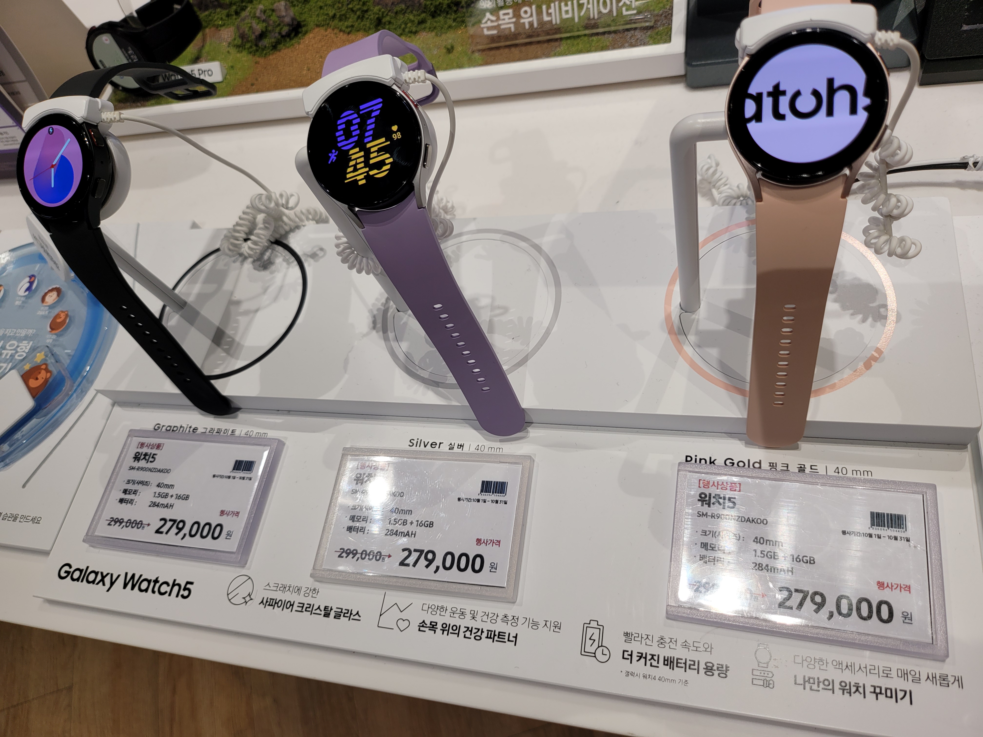 스마트워치 진열대에서 이리저리 왔다 갔다 하면서 워치5와 워치5프로를 비교해 보는데요.