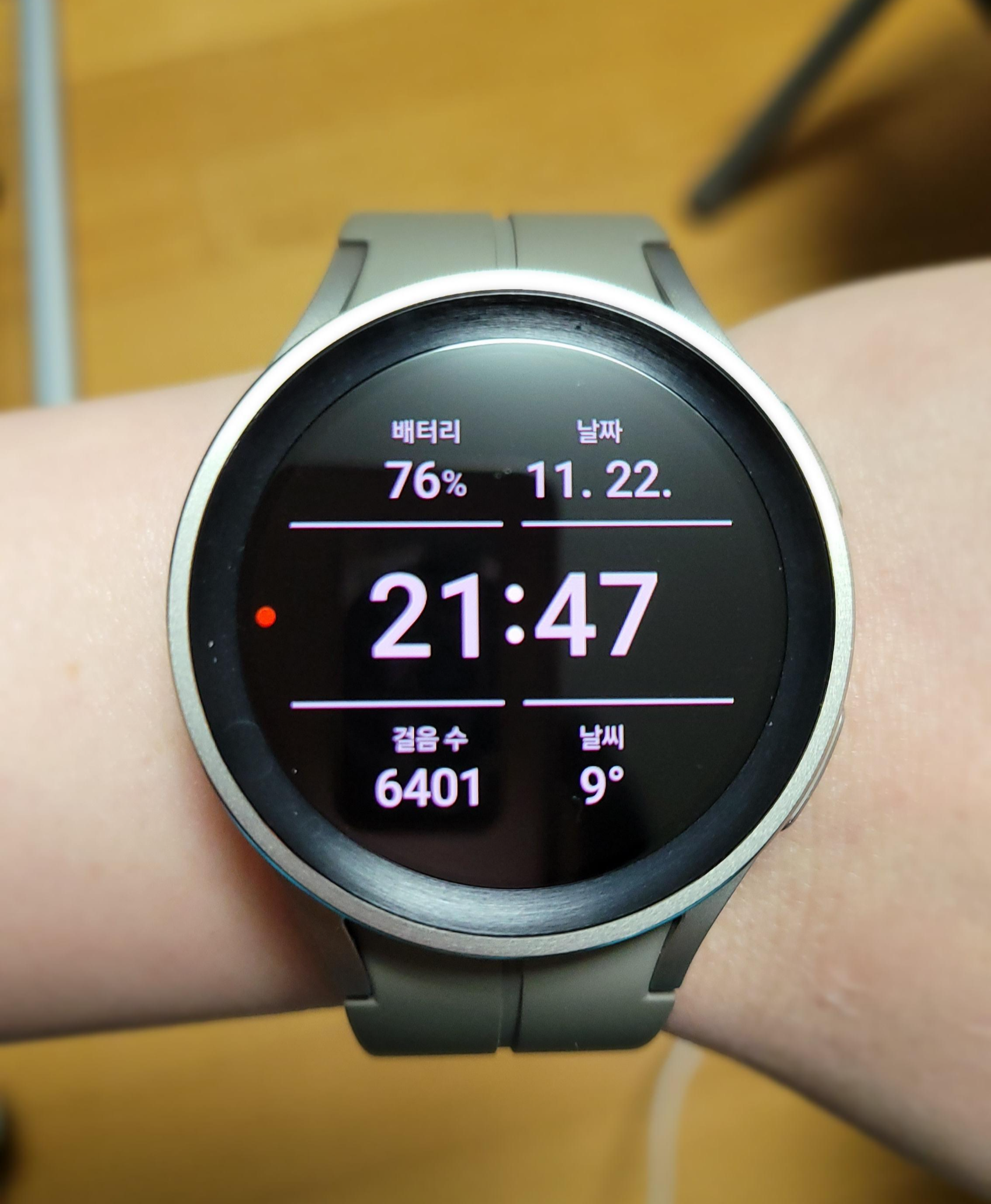 스마트워치 대비 아날로그 시계의 강점이 아무 때나 시계를 볼 수 있는 점인데요. 스마트워치에서 Always On Display(AOD) 기능을 켜 두면 언제든 아날로그시계처럼 시간을 확인할 수 있습니다. 그런 점에서 갤럭시 워치 5 프로의 오래가는 배터리는 스마트워치의 단점을 커버할 힘을 지니고 갖게 해 주는 것 같습니다.