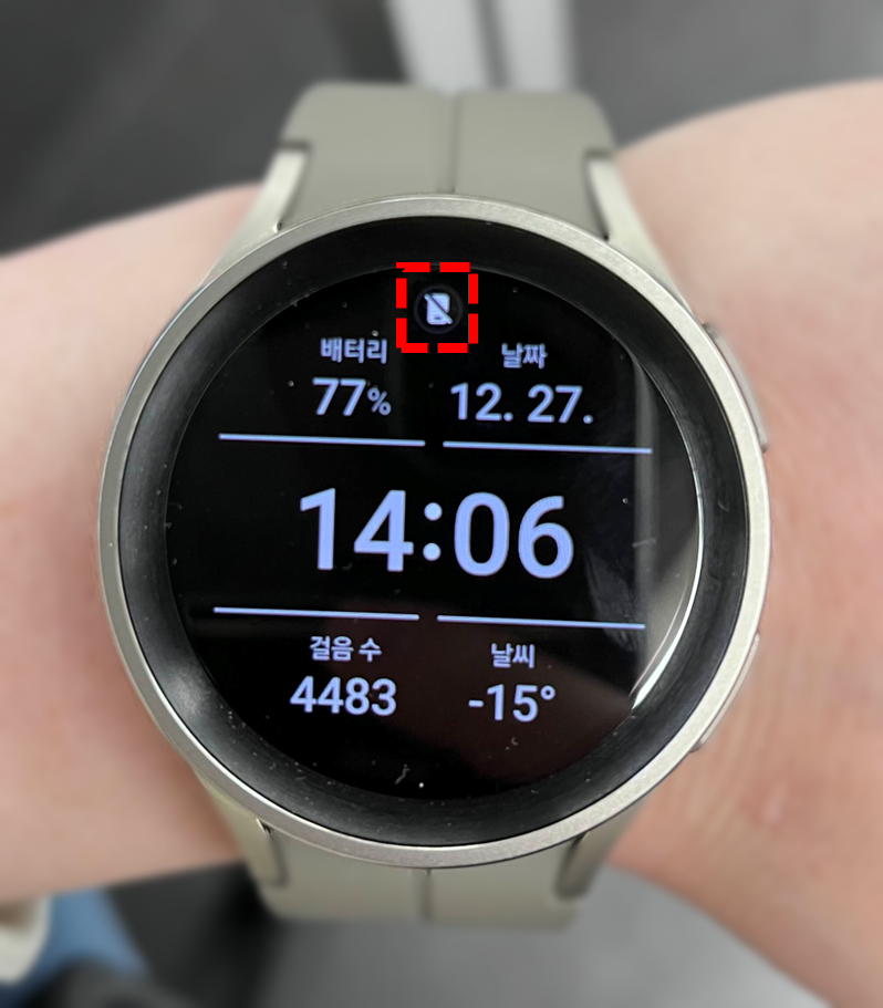 갤럭시 워치5 프로인데 스마트폰에 연결되지 않은 모습입니다. 기존에 사용하고 있는 갤럭시 폴드 2에 연결된 상태이고, 스마트폰은 집에 두고 안 가져갔습니다. 따라서 기존 폰에 연결은 되어 있지만 기기가 멀어져 블루투스 연결이 끊어진 상황입니다. 그래서 영하 15도라는 아침 저희 집 기온이 낮시간까지도 그대로 표시되고 있습니다.