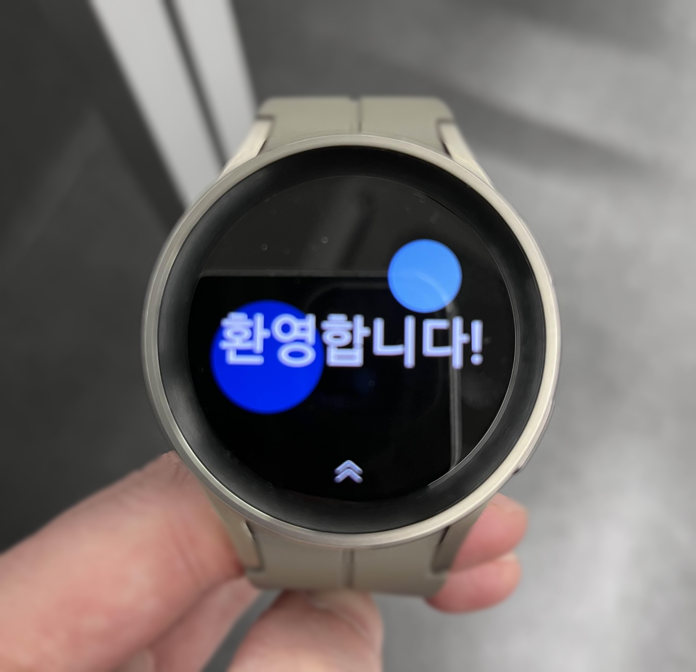 워치 5가 기존 스마트폰인 갤럭시 폴드 2에 연결되어 있으면 아이폰이 인식을 하지 못한다기에 워치를 초기화시키고 해 봤지만 결과는 여전히 '실패'였고, 워치 화면 설정에서 언어 선택 후 다음으로 넘어가지 않았습니다. 결국 출근할 때 기존 폰을 집에 두고 왔기 때문에 맨 위 사진처럼 시계로의 기능도 더 이상 사용할 수 없었습니다. 워치와 폰이 연결되지 않았기 때문에 계속 '환영합니다'라는 문구만 남았습니다.
