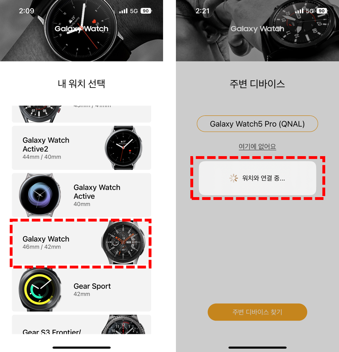 오늘 갤럭시 워치 5 프로를 아이폰에 연결시키는 방법을 열심히 구글링 했는데요. 갤럭시 워치4까지는 연결이 되는 것 같은데, 5가 연결되었다는 사례를 찾을 수 없었습니다. 일단 기존 방법대로 위 이미지 중 왼쪽처럼 갤럭시 스마트 워치 앱을 실행시키고, 해당 워치를 찾아야 하는데 워치5 모델은 없었고, 제일 유사한 Galaxy Watch를 선택했는데요.(빨간 점선 박스) 결과는 오른쪽 이미지처럼 계속 워치와 연결 중이라는 메시지만 뜰뿐 아이폰 연결에는 실패했습니다.