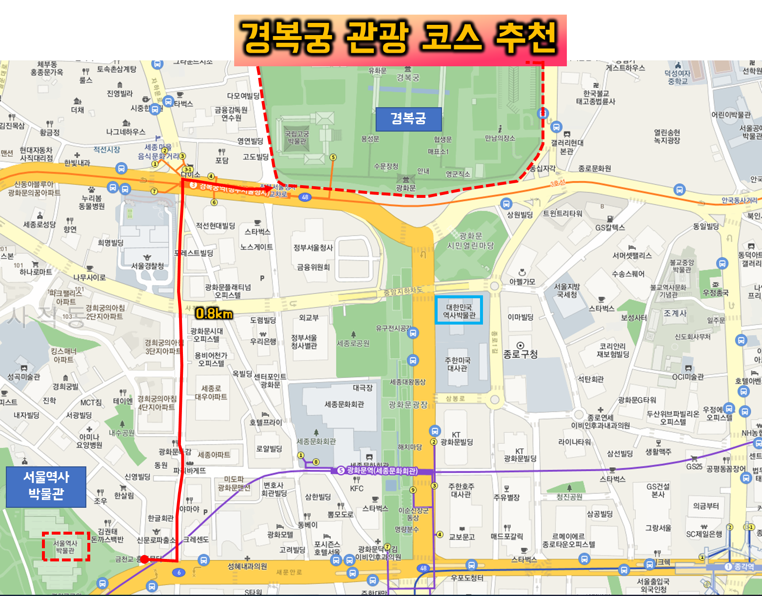 경복궁 관광 코스로 제일 먼저 서울역사박물관이나 대한민국 역사박물관에서 역사 지식을 공부한 다음 경복궁에 가시길 강력 추천드립니다. 대한민국 역사박물관 8층 옥상공원에 올라서면 경복궁의 수려한 자태를 내려다볼 수 있어 멋진 사진 촬영 포인트이기도 합니다.