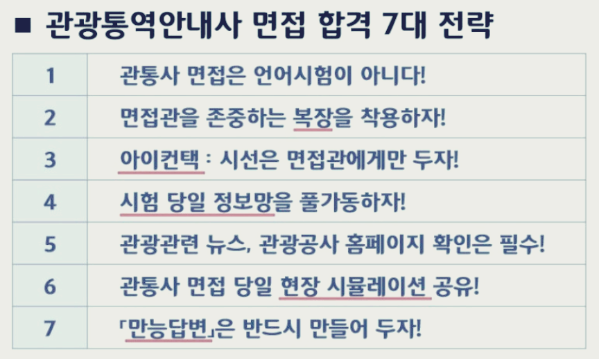관광통역안내사 면접시험을 앞두고 관광통역안내사 면접 합격 7대 전략이라는 주제로 영상을 만들었습니다.