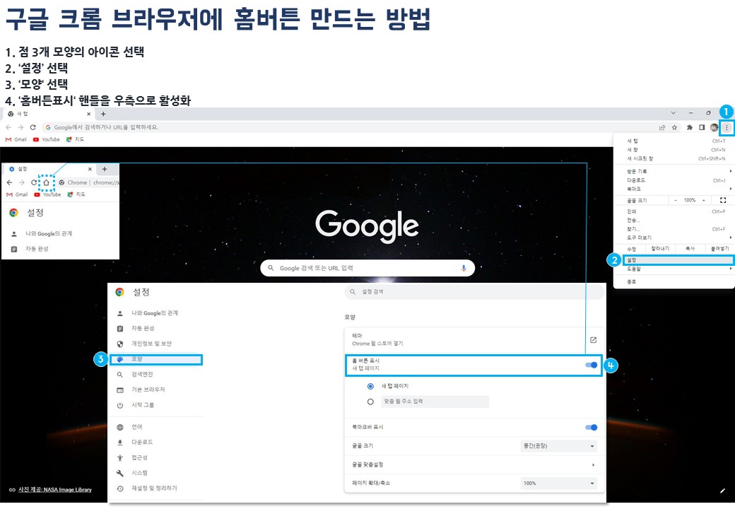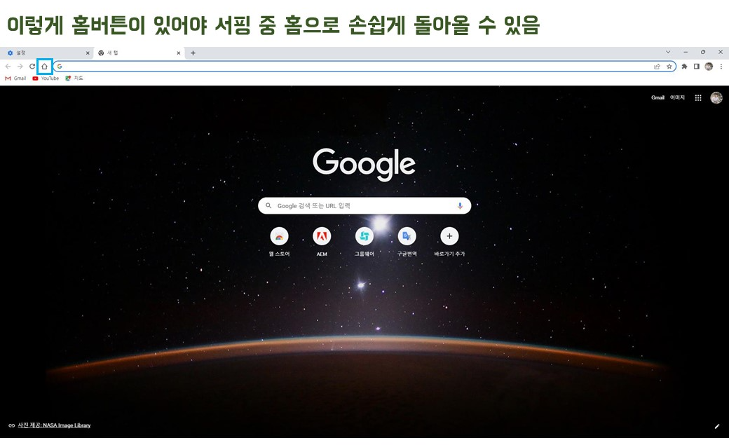 아래 한 장짜리 매뉴얼을 보신다면 쉽게 홈버튼 모양 아이콘을 크롬에 추가할 수 있을 것 같습니다.