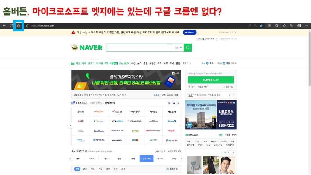 이럴때 아래 마이크로소프트 엣지처럼 홈버튼이 있으면 바로 돌아오는데, 구글은 최초 설치 시 홈버튼이 감춰져 있기 때문에 설정에서 홈버튼을 추가해 줘야 합니다. 구글에는 외국 자료 등 자료양이 방대하기 때문에 요즘은 구글에서 검색을 많이 하는 편인데, 역시 편리한 건 우리 토종 네이버인 것 같습니다.