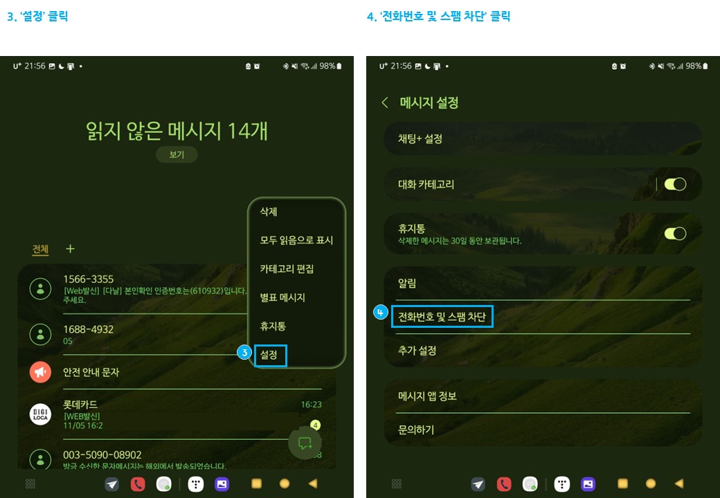 스마트폰 문자 메시지 설정에서 스팸 차단문구 설정하는 방법