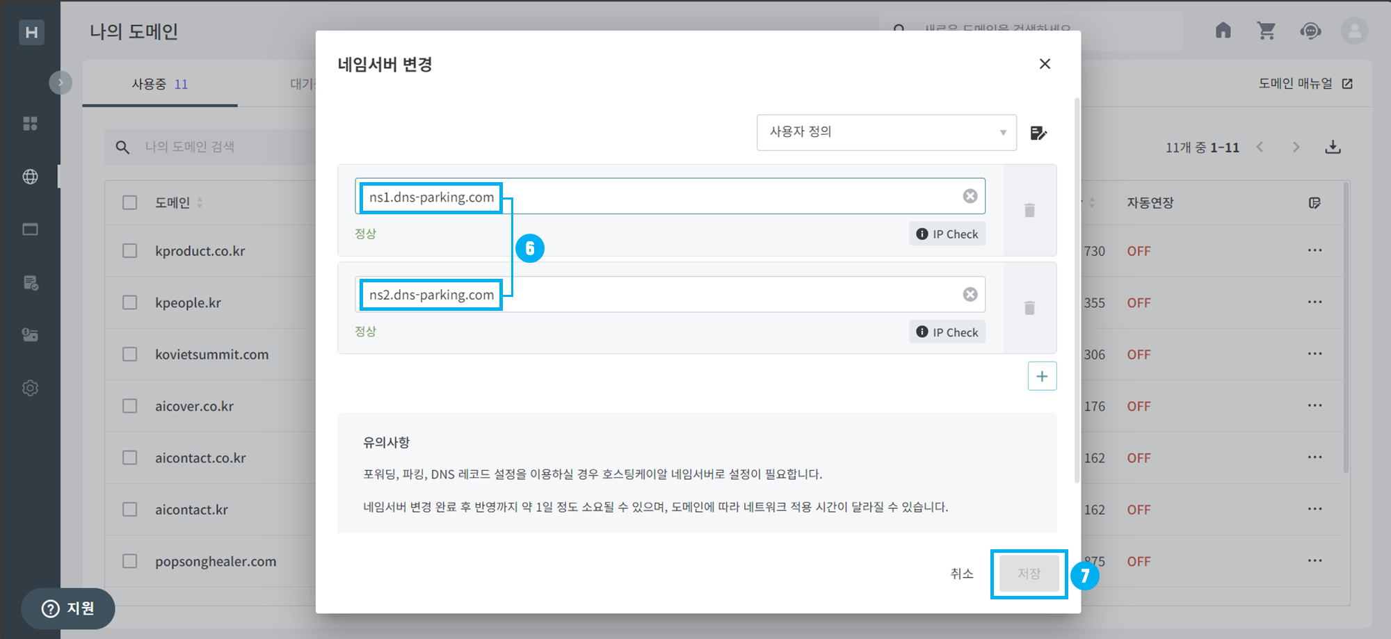 ⑥ 2번 매뉴얼에서 파악한 새로운 웹호스팅 업체의 네임 서버 복사 후 붙여 넣기