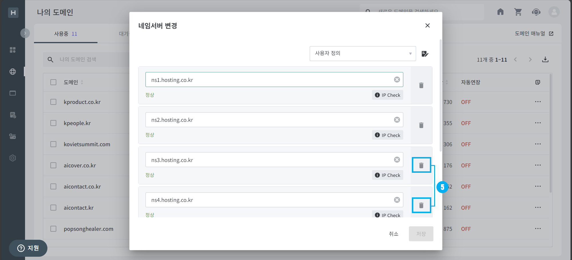 ※ 호스팅어에서의 네임서버는 2개만 필요하기 때문에 3번, 4번 칸은 삭제해 줍니다.