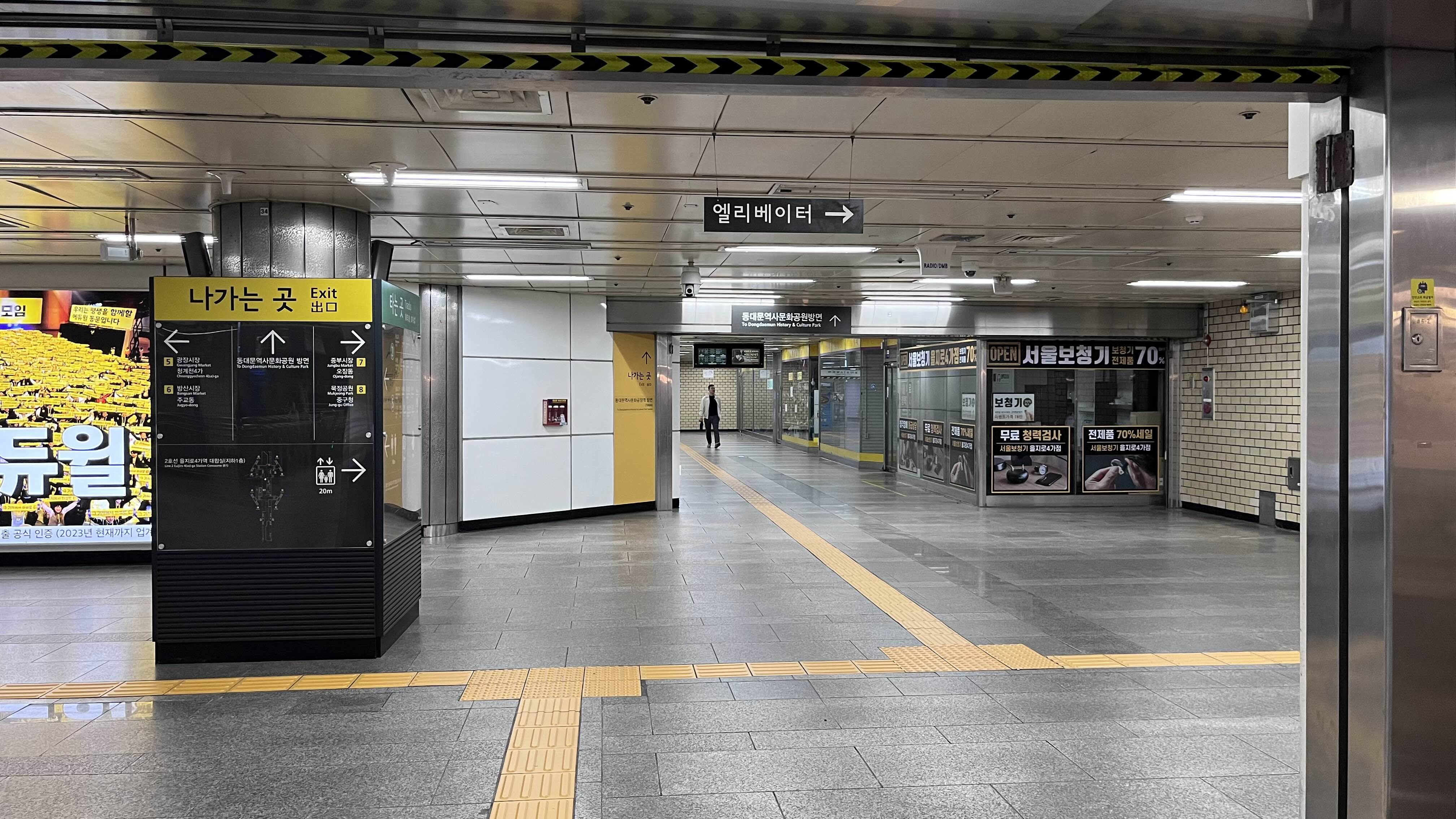 노란색 나가는 곳, 그리고 서울보청기 매장 앞 천정에 "동대문역사문화 공원방면"이라고 표시가 돼 있습니다. 처음 가보는 사람이 알 수가 있나...ㅠㅠ