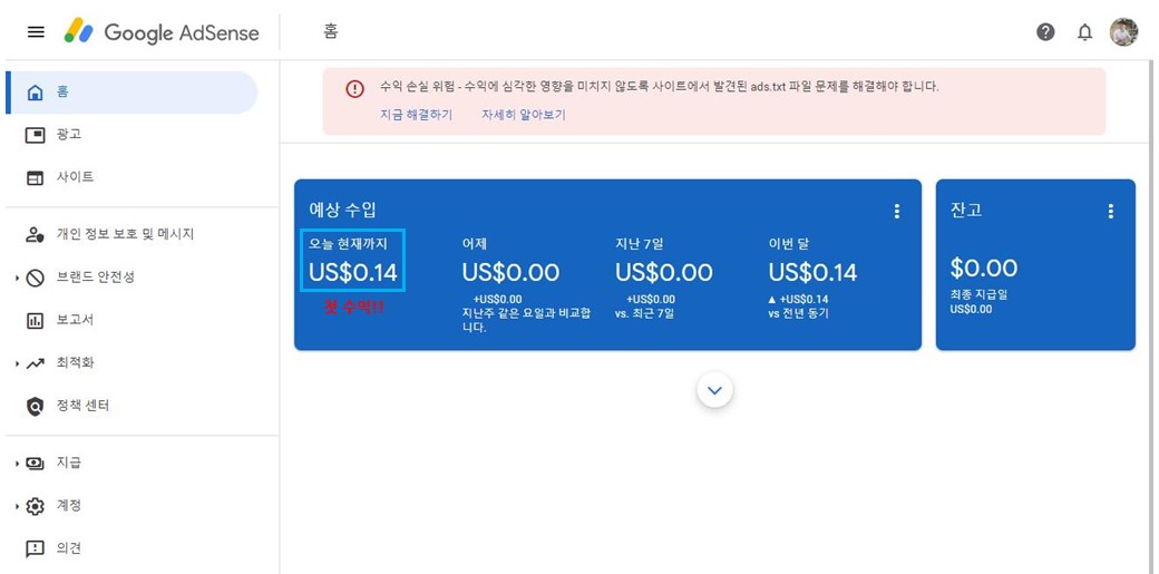 애드고시에 합격하고 나니 너무나도 감격스럽고, 첫날 0.14달라까지 벌었으니 이 얼마나 좋습니까?ㅠㅠ