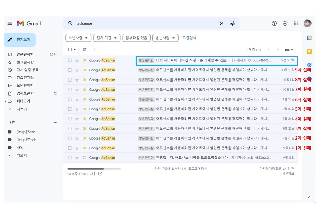 여러분, 제가 드디어 구글 애드센스 승인을 받았습니다. 그것도 아홉번의 도전, 9수 만에 이룬 쾌거입니다.