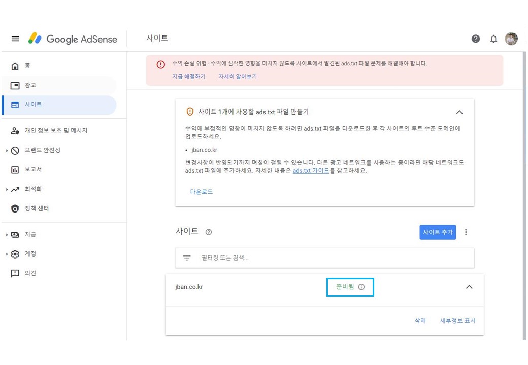 수익 손실 위험 - 수익에 심각한 영향을 미치지 않도록 사이트에서 발견된 ads.txt 파일 문제를 해결해야 합니다.