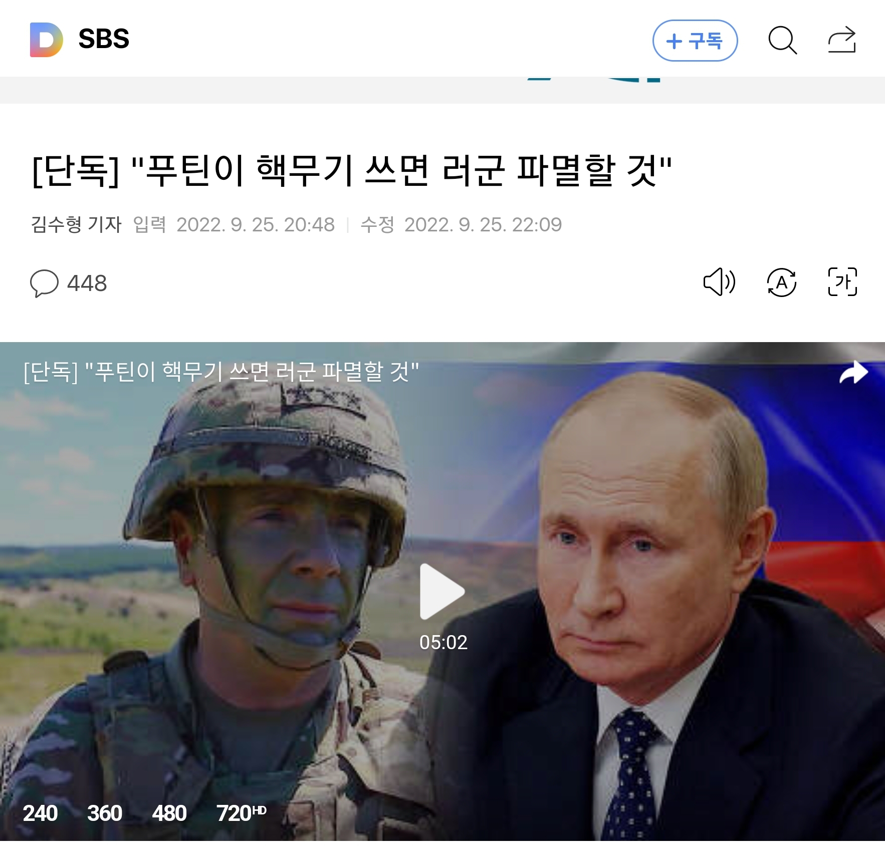 오늘 저녁 SBS 뉴스에서 미군 전 유럽 사령관 출신이 러시아가 핵무기를 사용하게 되면 미국이 가만히 있지 않을 이유, 즉 핵전쟁이 날 수 밖에 없는 이유를 설명했습니다.