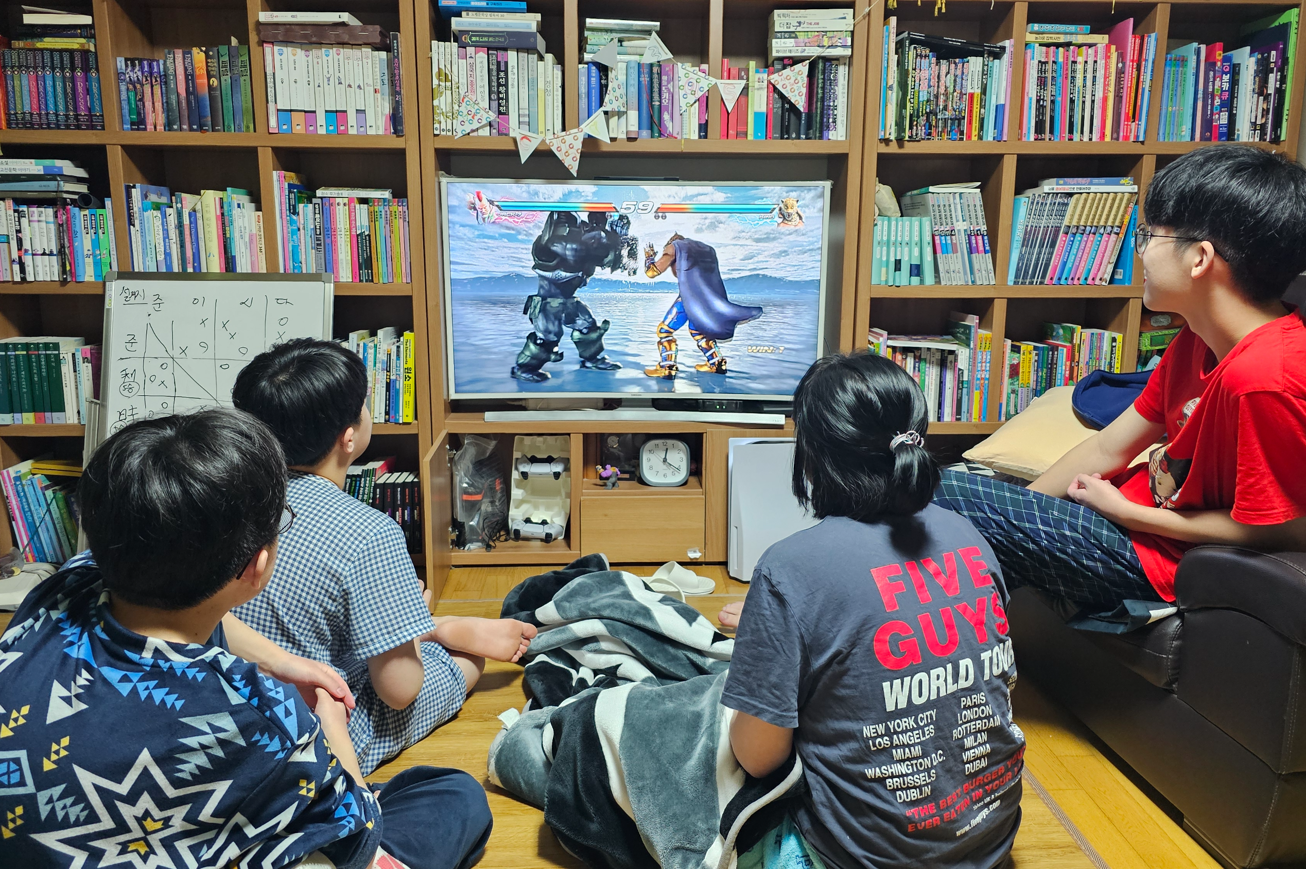 철권의 큰 장점으로 1:1 대전 게임이니까 롤플레이 게임처럼 오랜 시간을 투자하지 않아도 되니까 중독될 위험이 적고, 저희처럼 식구가 많은 집이라면 돌아가면서 하니까 체력 안배도 되는 것 같습니다. 초보자인 엄마는 깍두기로 결투를 했고, 저는 삼 형제와 설거지 게임을 했습니다. 아래 사진에서 TV 왼쪽 옆에 대진표를 짜둔 화이트보드가 보이네요.