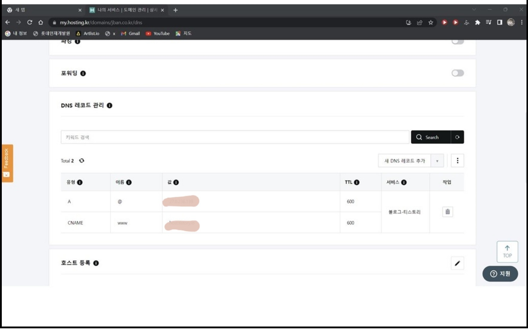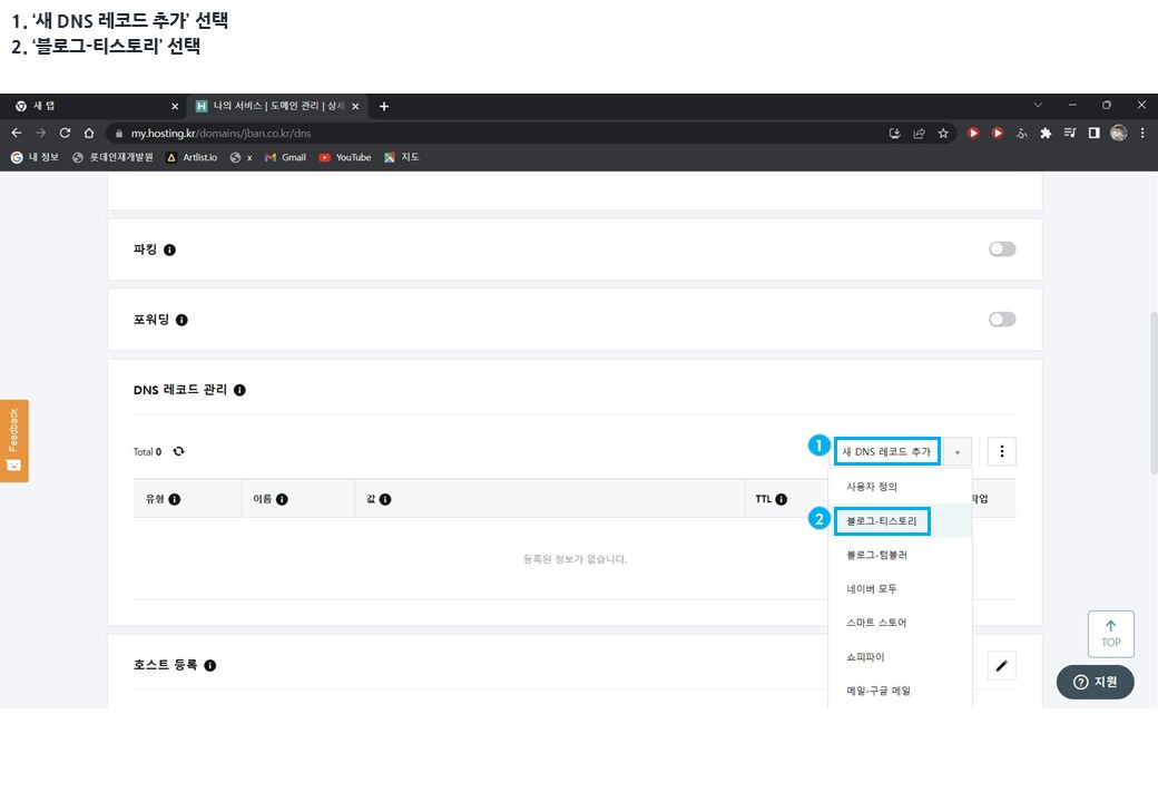6. 새 DNS 레코드에 티스토리 추가