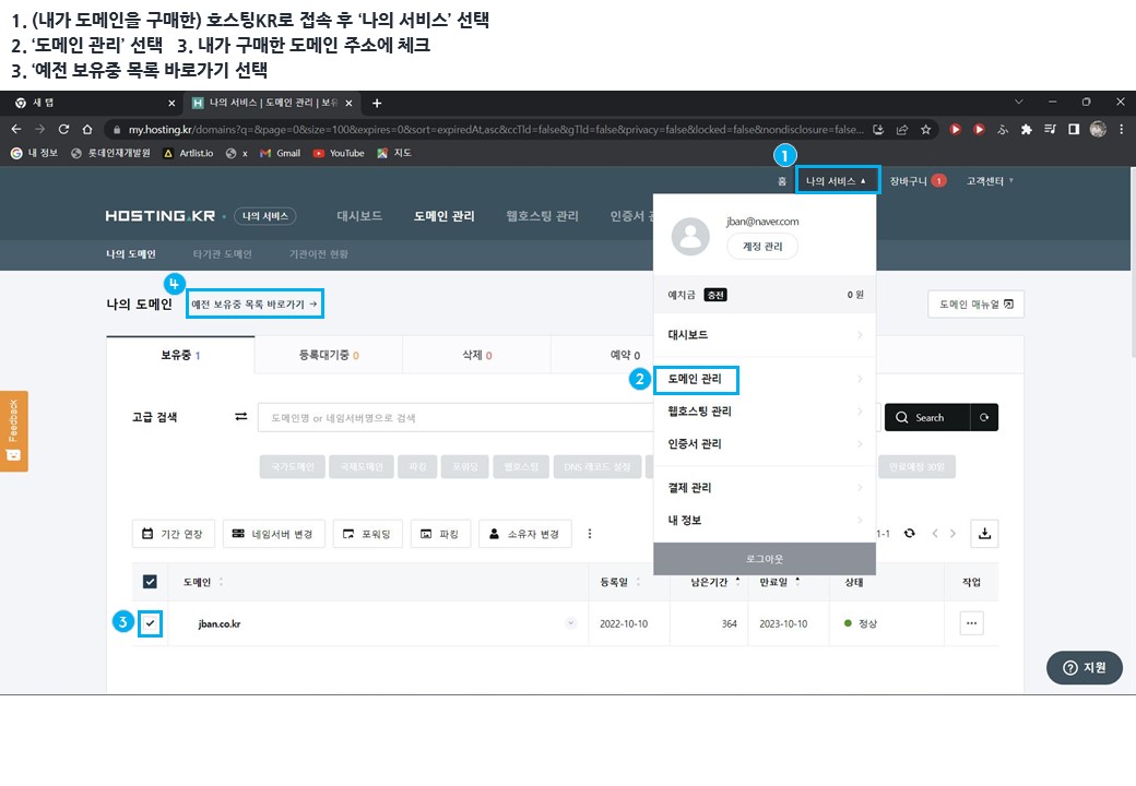 1. (내가 도메인을 구매한) 호스팅KR로 접속 후 ‘나의 서비스’ 선택