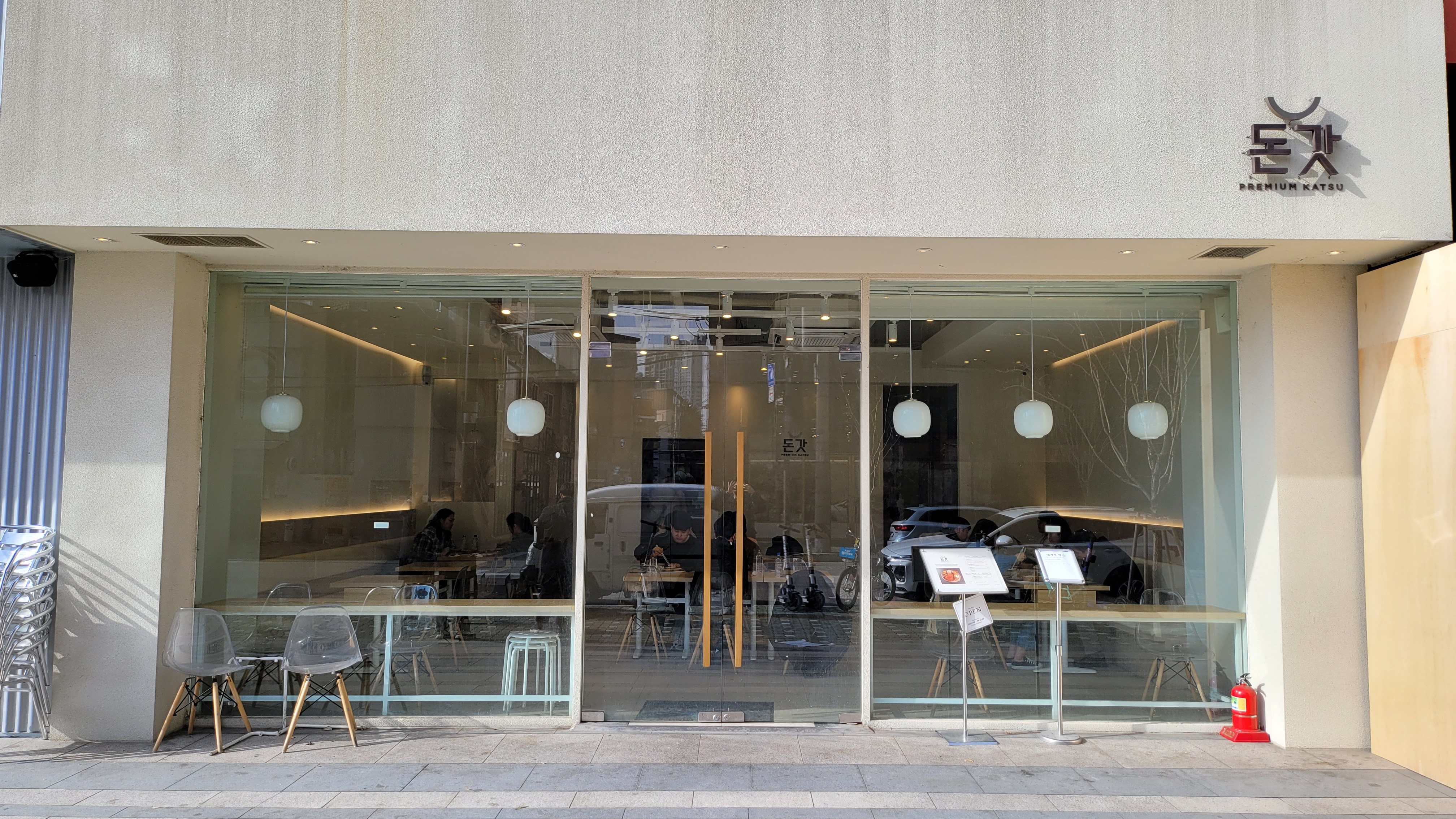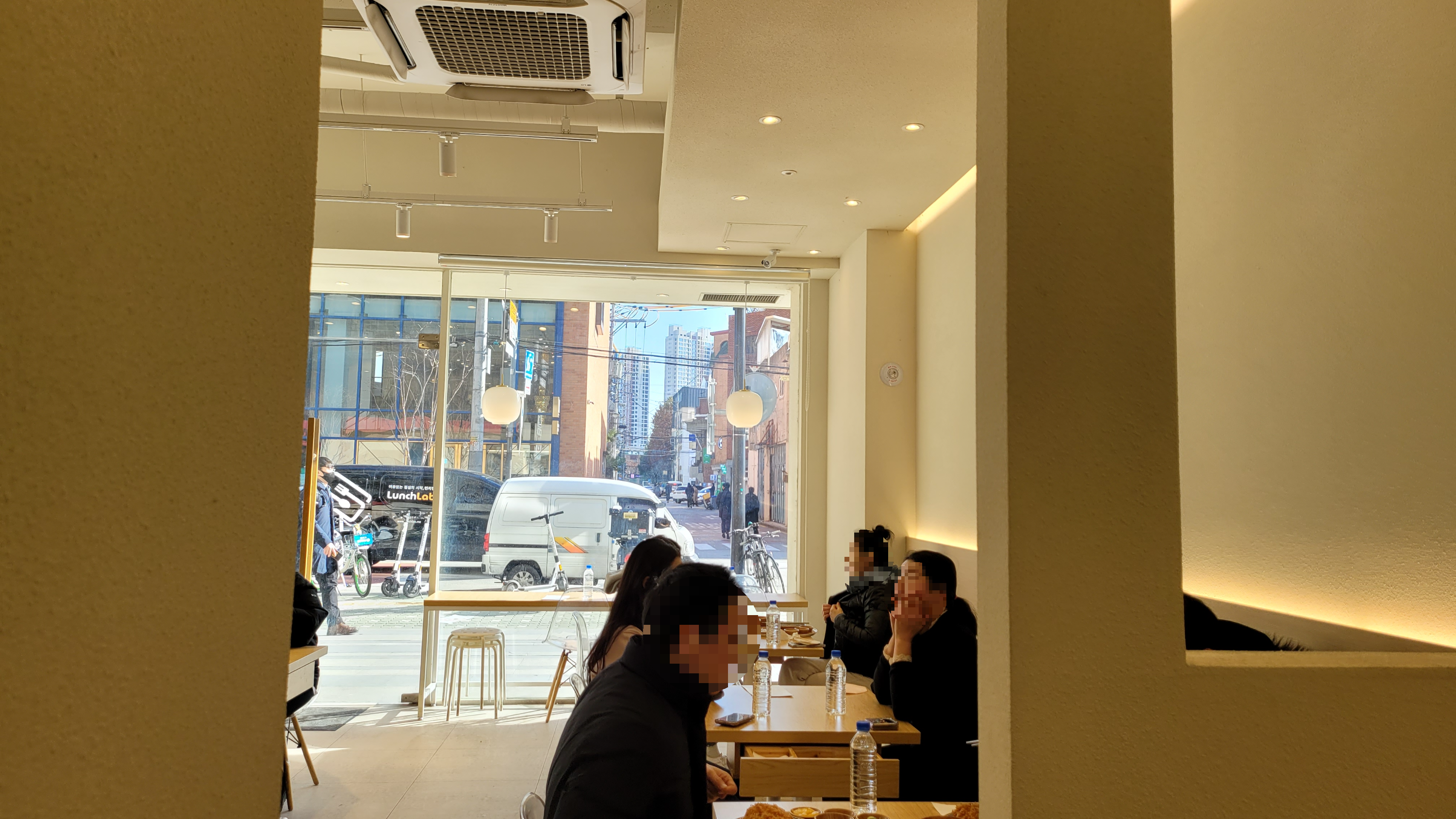 이렇게 룸처럼 코너에 자리가 있는데요. 생각보다 앞/뒤 간격이 매우 좁아서 불편하긴 했지만, 이 추운 날 밖에서 웨이팅 하는 것보다는 낮죠^^;; 유리창 밖으로 보이는 풍경은, 첫 번째가 자주 찾는 대형 커피숍 '훔볼트' 골목길로 조금 들어가면 베트남 쌀 국숫집 'Noi'와 같은 건물 2층에 있는 라면 전문점 '라무라'가 있습니다.