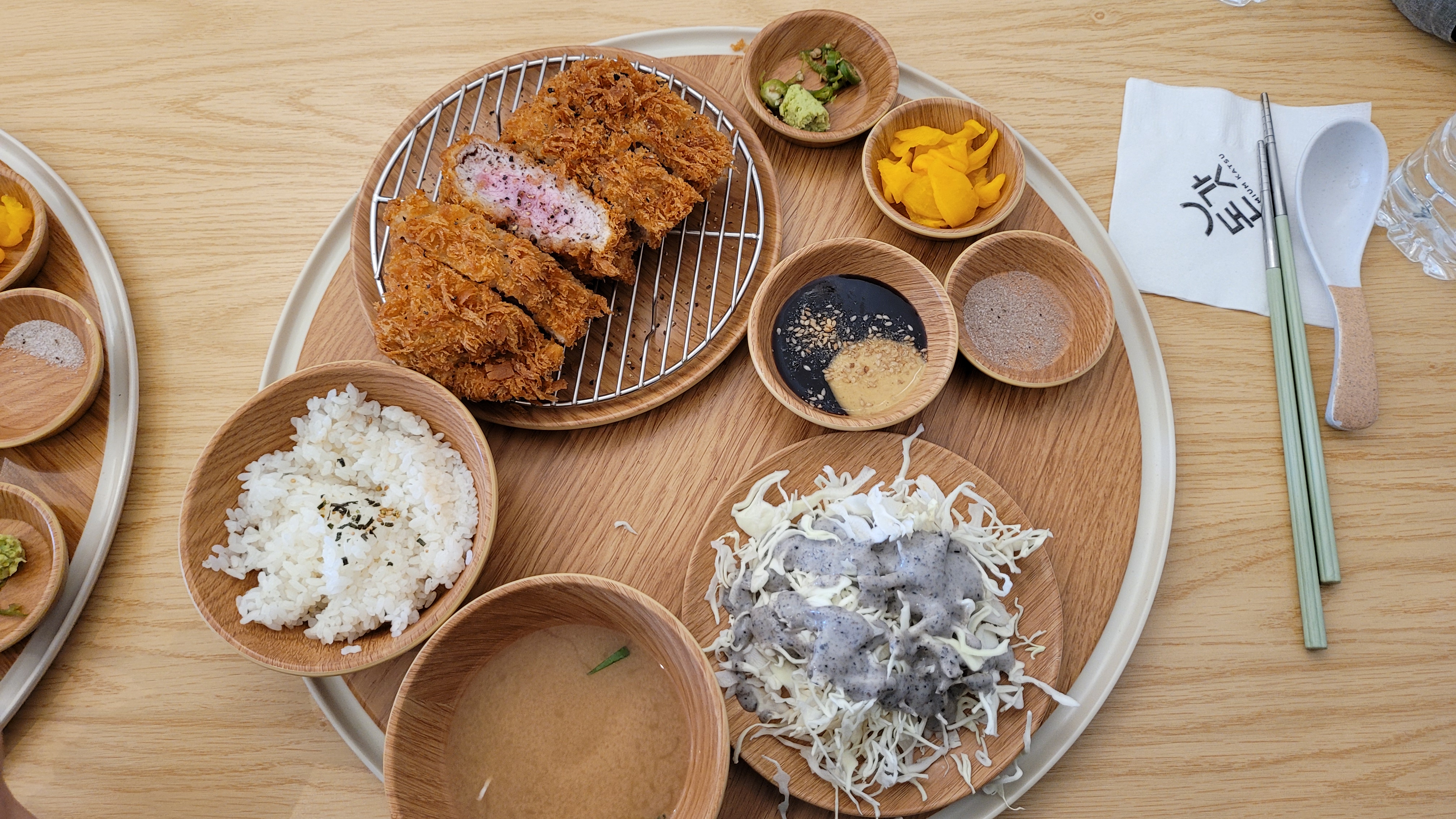 드디어 제가 주문한 안심 돈가스가 나왔습니다. 이 쟁반을 받아 보고 6첩 반상 같다는 생각이 들던데요.