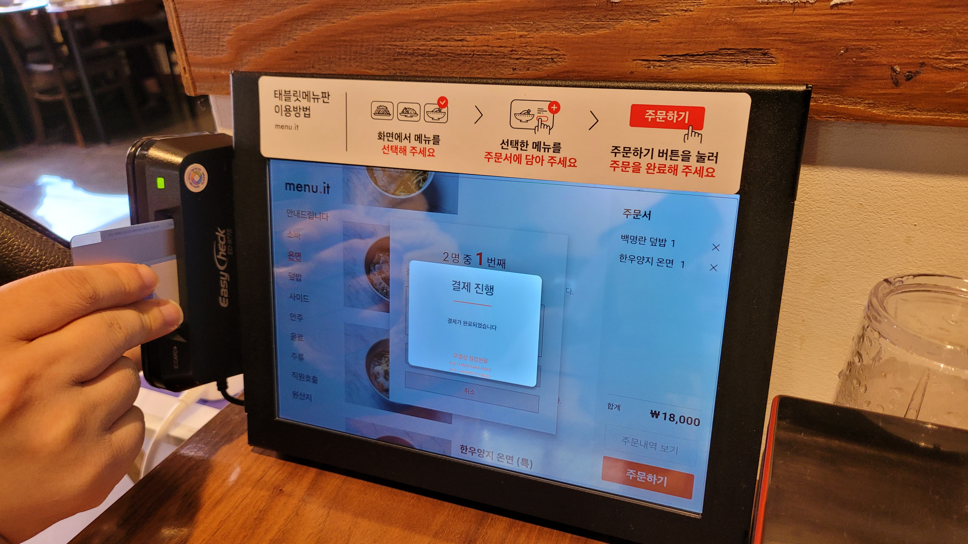 다른 식당에서도 태블릿을 많이 도입하는 추세지만, 이렇게 결제까지 되는 곳은 많지 않은 것 같은데요.