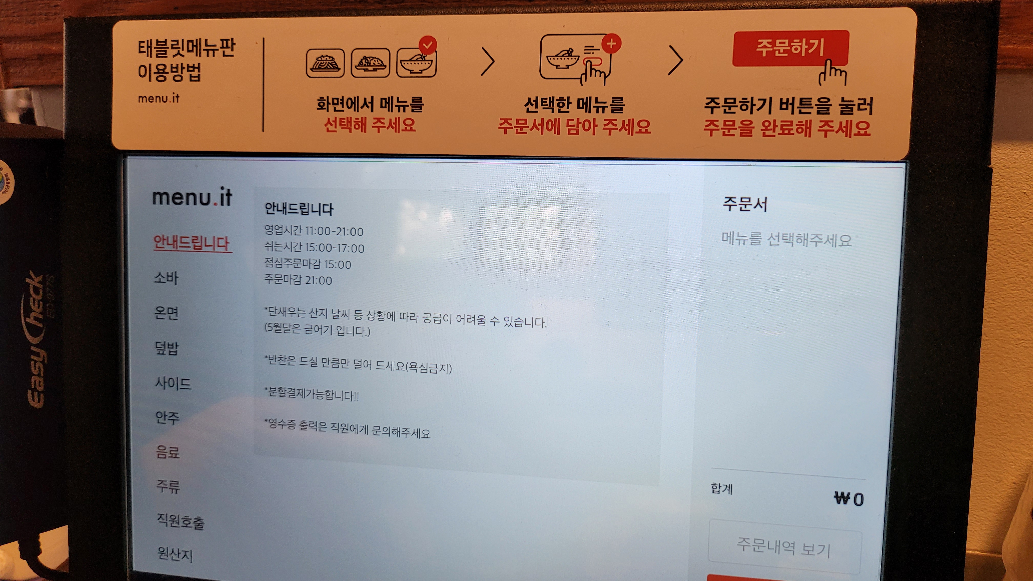 요즘 새로 생겨나는 식당들은 이렇게 태블릿으로 주문 받는 시스템을 갖춘 곳이 많은 것 같습니다.