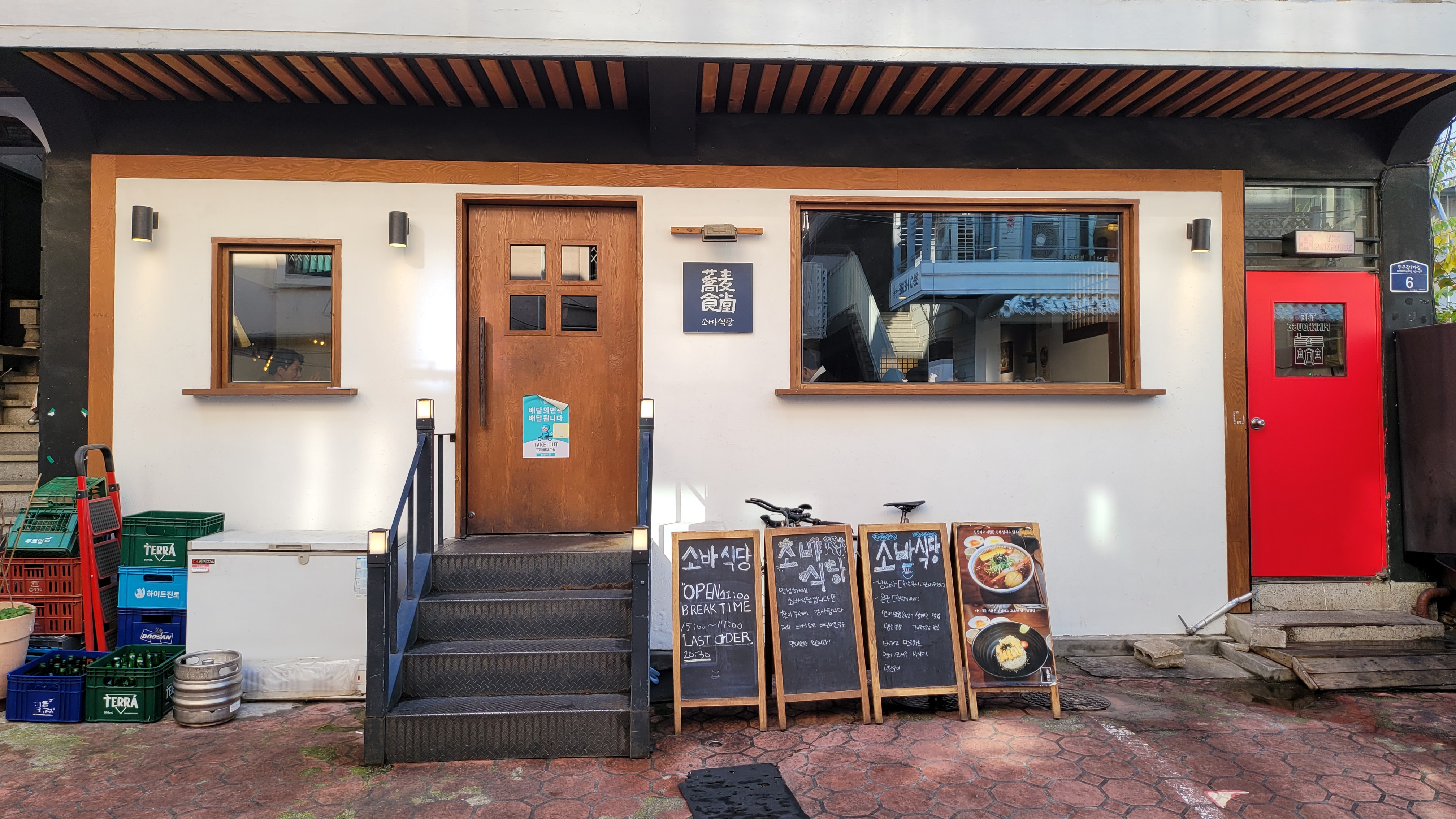 소바식당의 출입구 및 깔끔한 모습의 전경입니다.