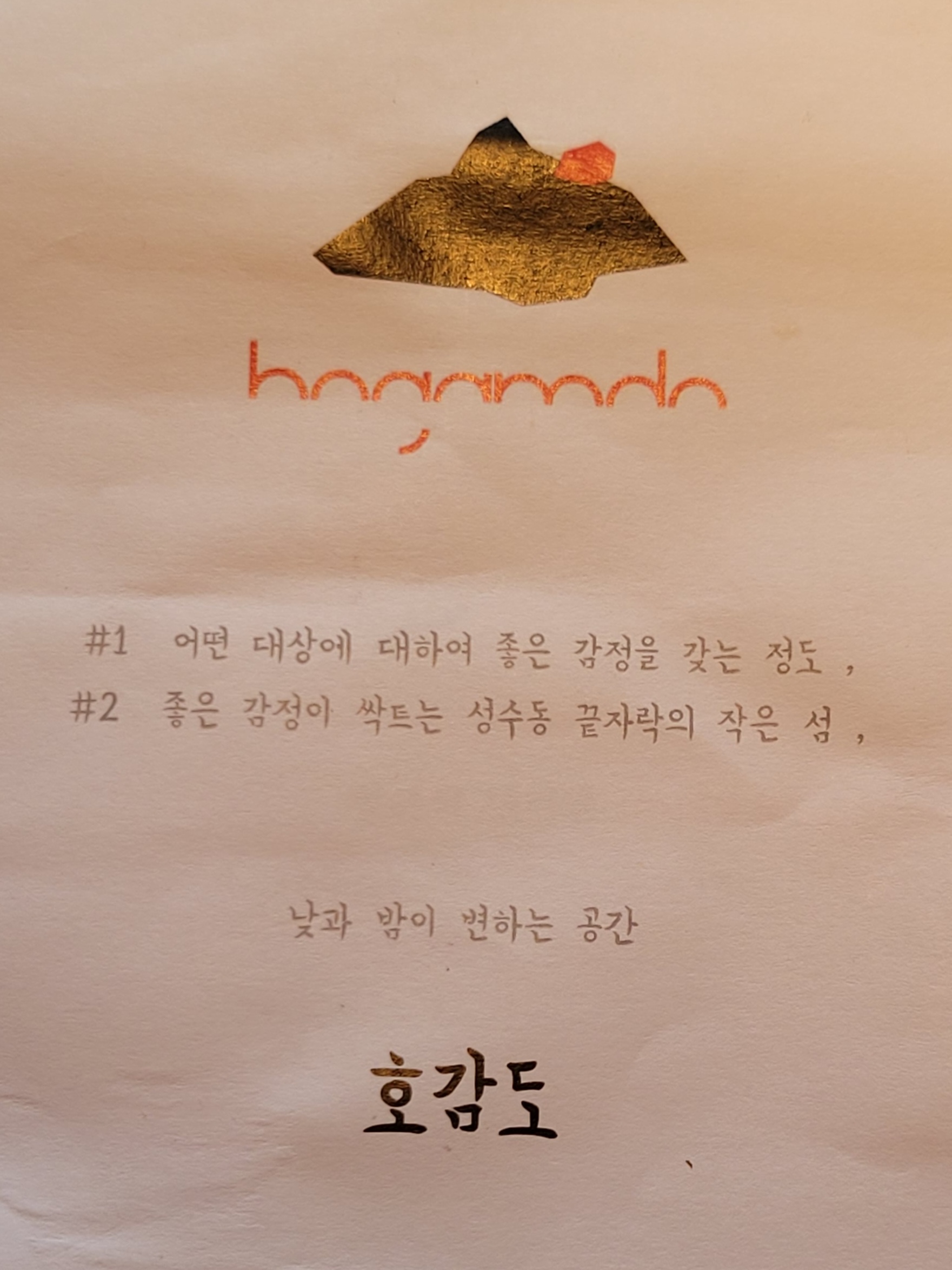 좋은 감정이 싹트는 성수동 끝자락의 작은 섬, 이라는 뜻이 있네요. 뚝섬 한강공원이 근처니까 호감도의 '도'는 뚝섬에서 따온 모티브가 아닐까 생각해 봅니다.