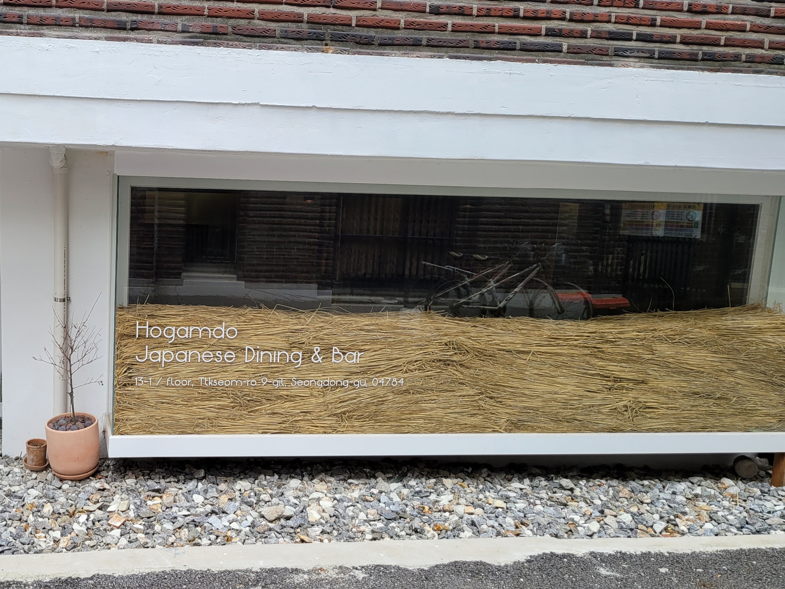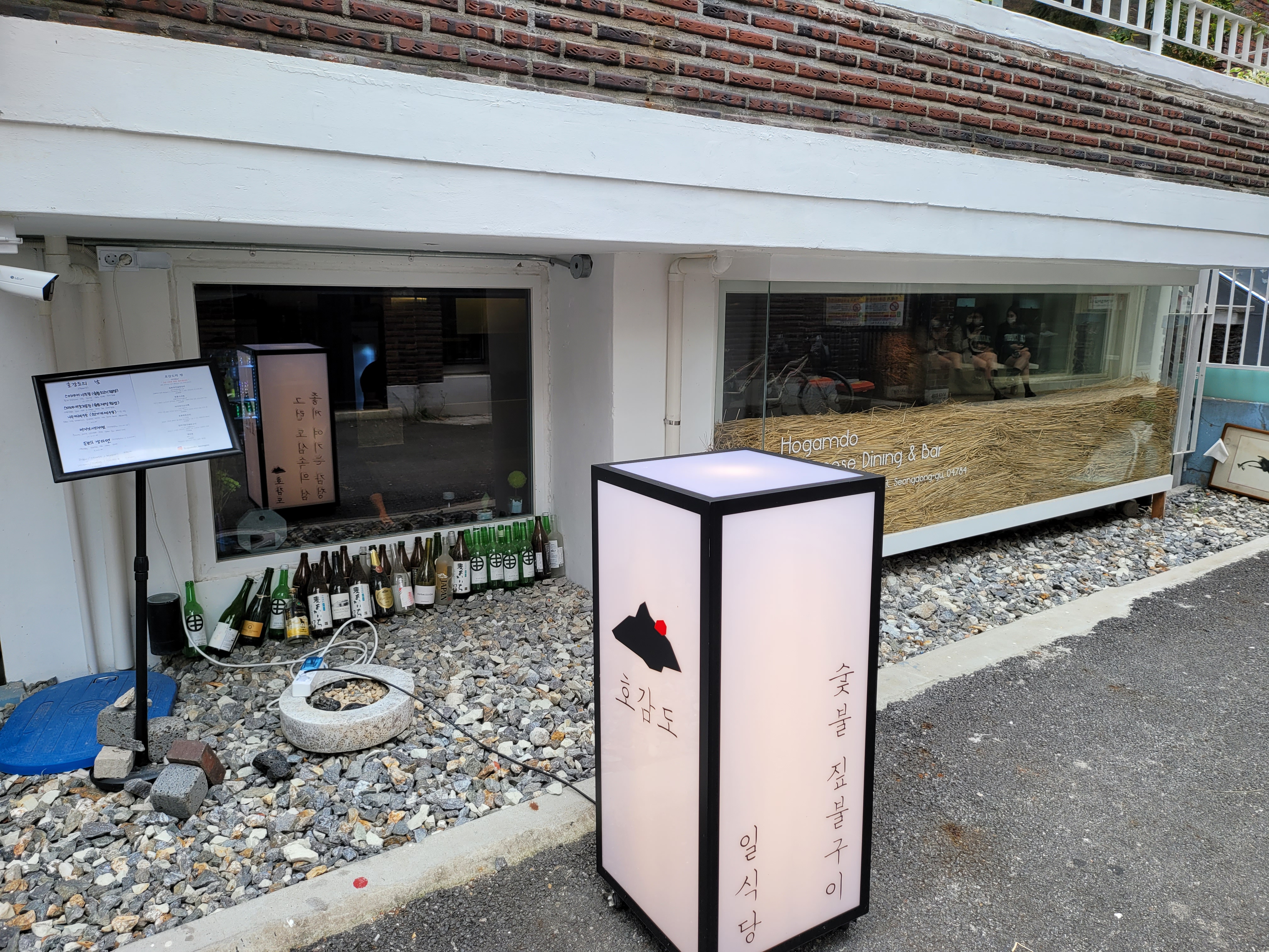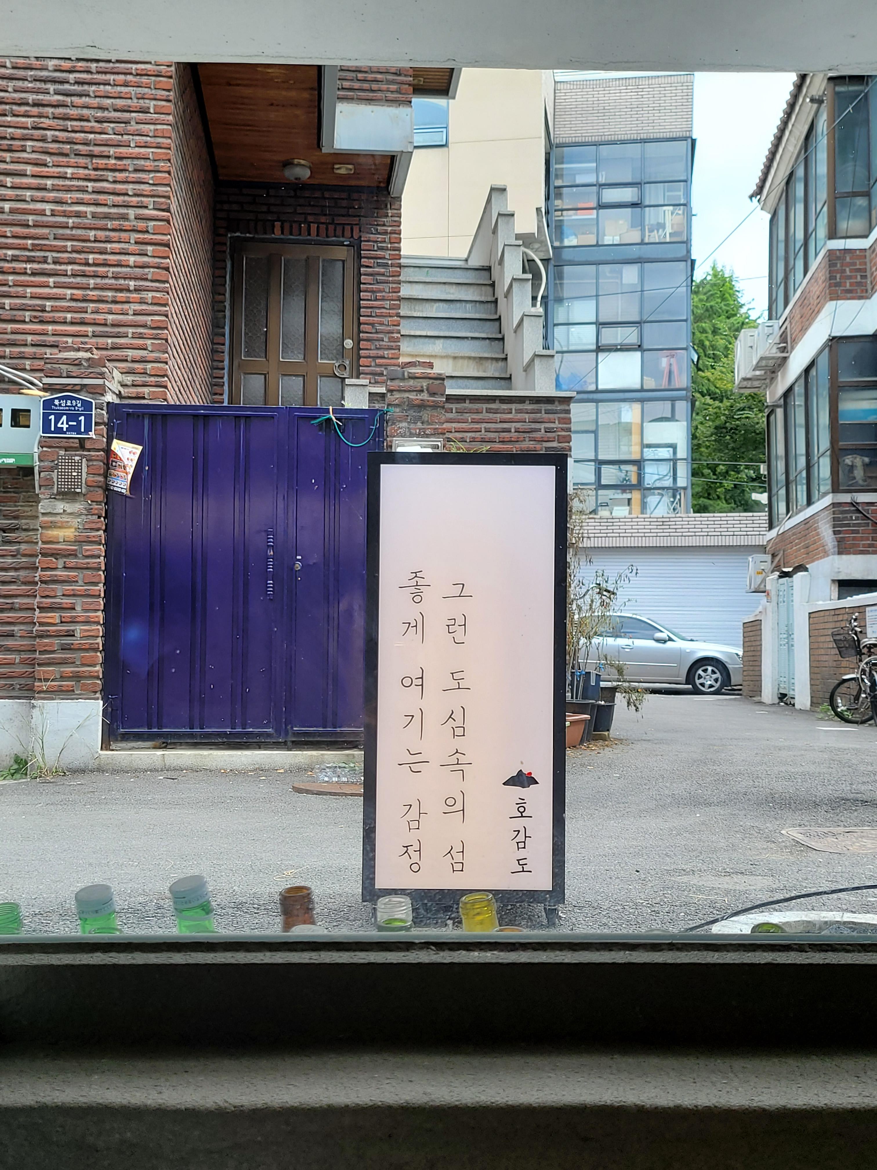호감도는 성수역 3분 출구에서 대략 6~7분 거리에 있는데요. 주택가에 있지만 큰 길가에서 멀지 않기 때문에 어렵지 않게 찾으실 수 있을 것 같습니다. 가게 앞에 있는 입간판도 특이하고, 반지하 유리창문에 끼워져 있는 짚도 특이하고, 유리창 앞에 세워둔 술병도 특이한 느낌을 줍니다.