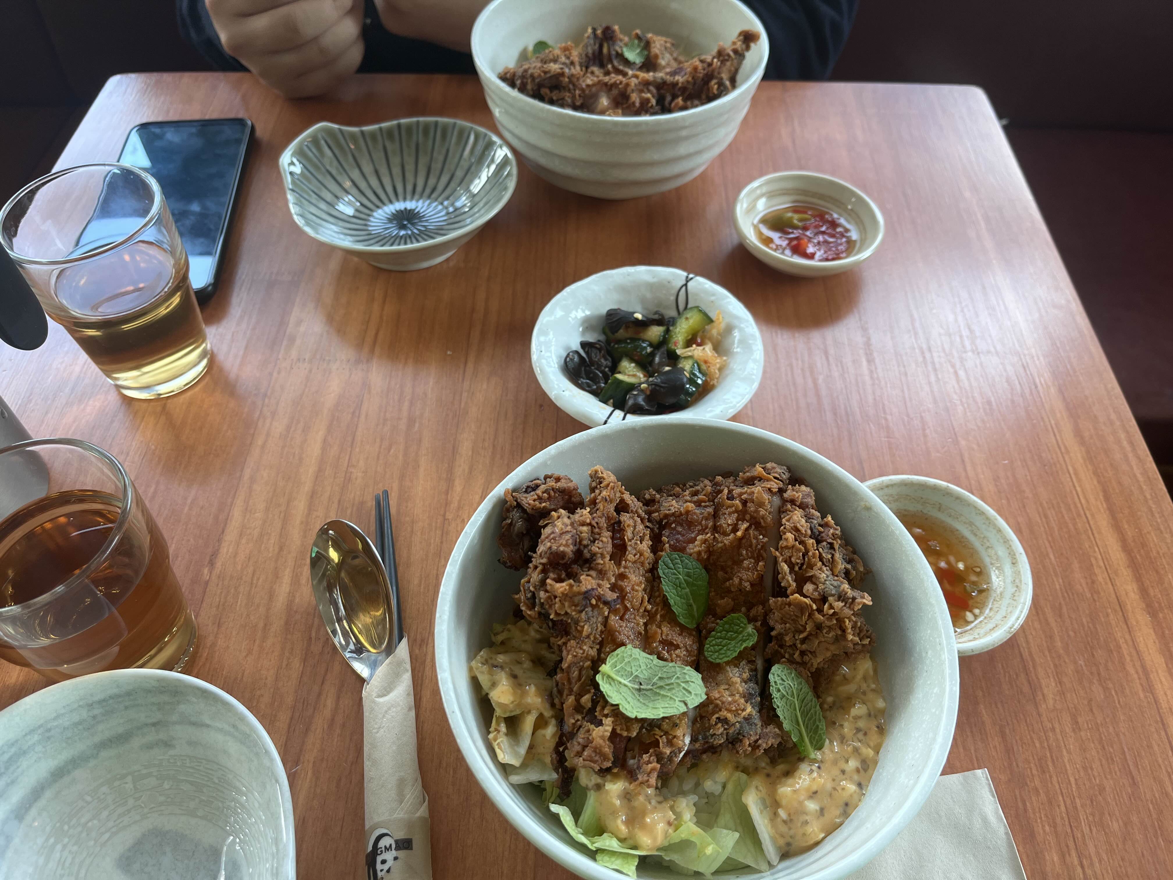 시옹마오의 메뉴판입니다. 분명히 중국풍 같았는데, 메뉴 이름에 '옹박'이라고 적혀 있는 걸 보며 여기 태국풍인가? 그런 생각도 했었습니다. 저는 옹박 치킨 덮밥을 주문했는데요. 메뉴판 왼쪽에 있는 스몰러나 사이드를 추가해도 좋을 것 같았습니다. 한 가지 맛만 보는 것보다 친구들끼리 가서 이것저것 샘플로 즐기는 것도 좋지 않을까요? 다음에는 탄탄면이나 우육면을 먹어보면 좋겠다는 생각이 들었습니다. 연두부와 고수 무침도 시키고~~~
