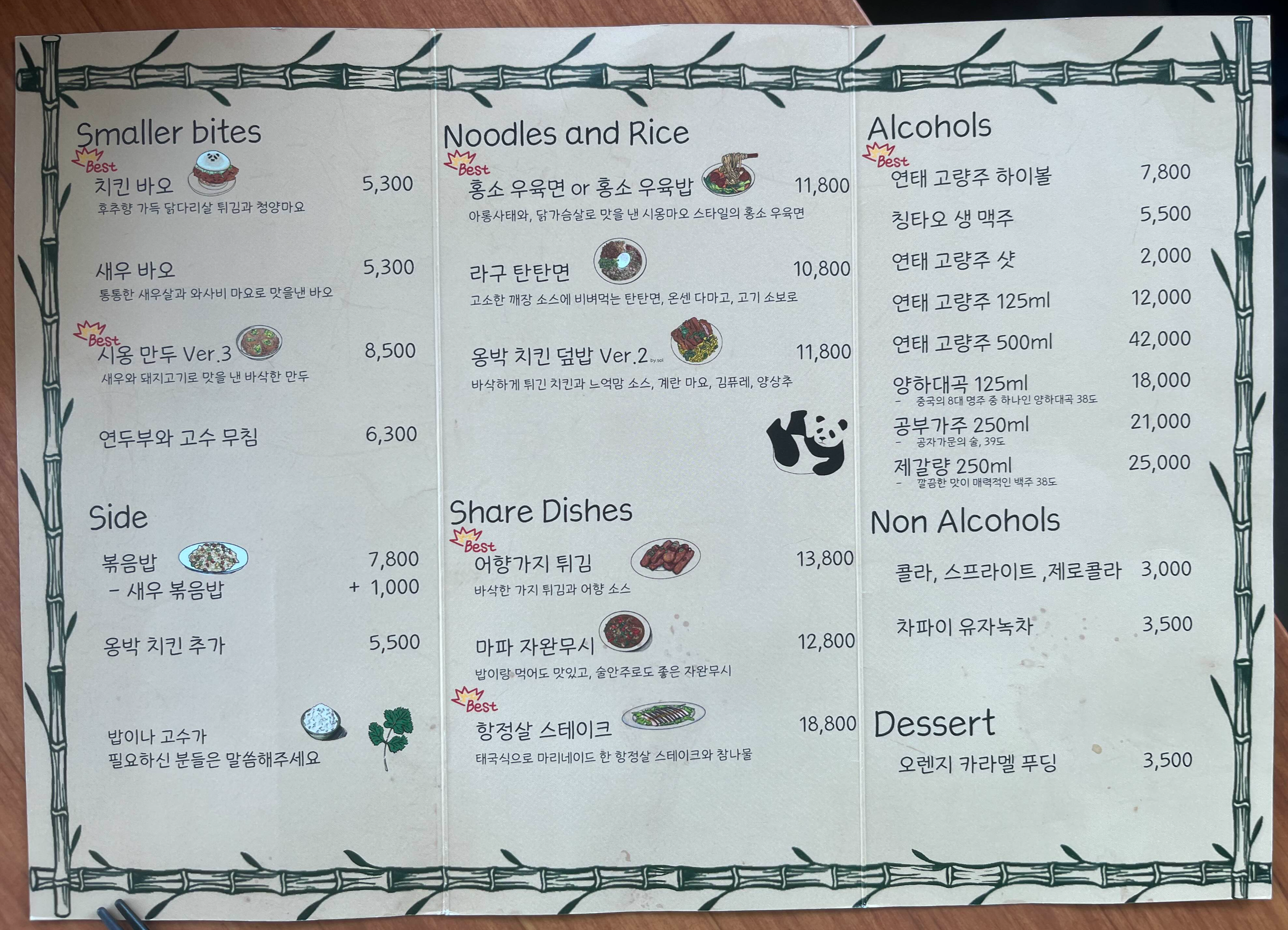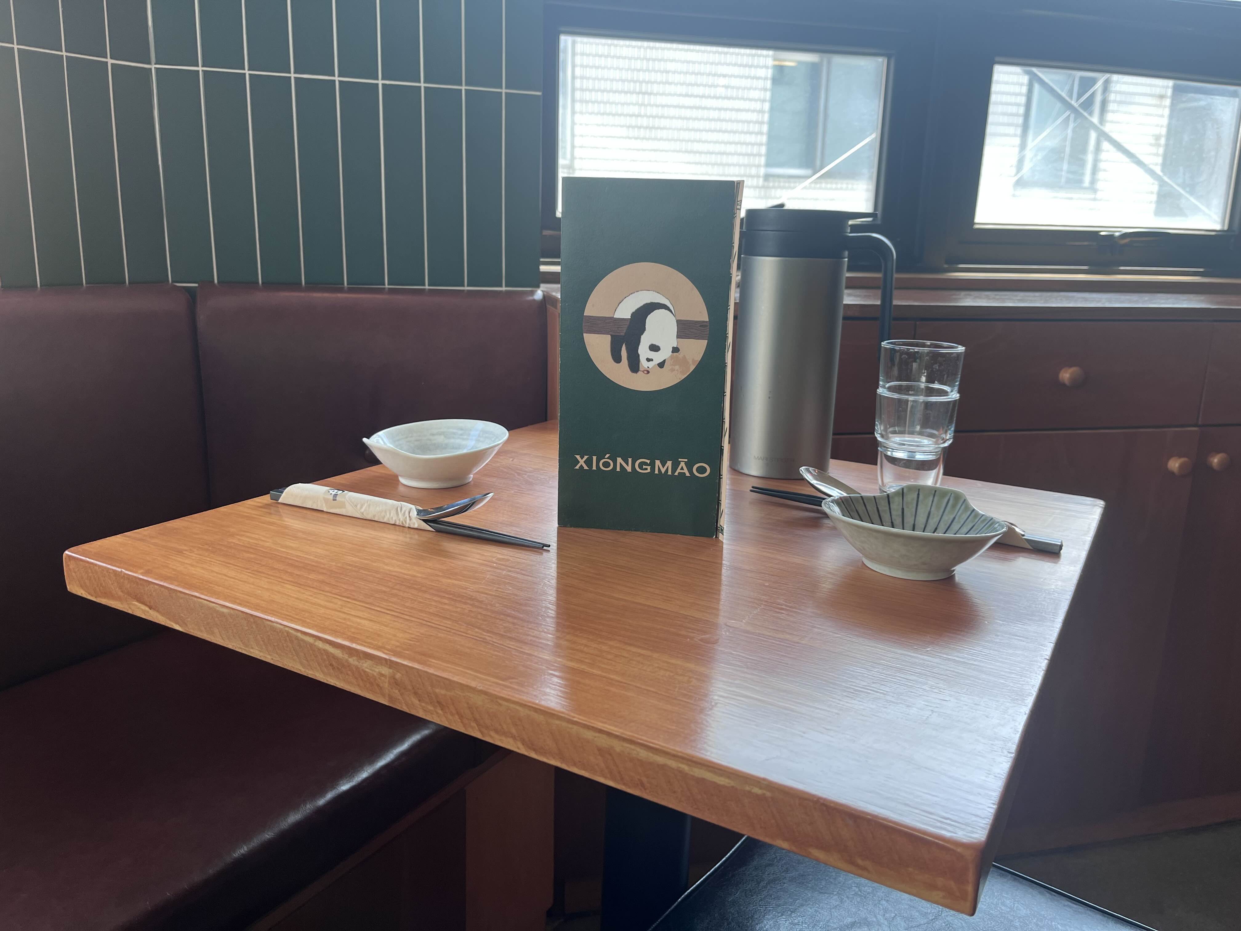 아담한 2인용 테이블 위에 팬더 곰이 그려져 있는 메뉴판이 놓여 있습니다. 시옹마오가 중국어로 판다일 줄이야...