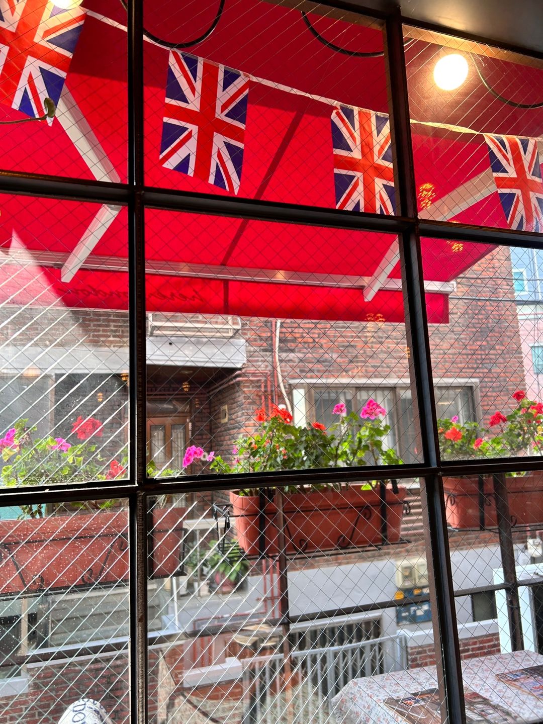 빨간색 어닝이며, 어닝 아래에 있는 영국국기, 창틀에 걸려있는 화분까지~~~ 영국 느낌 많이 나는 곳입니다.