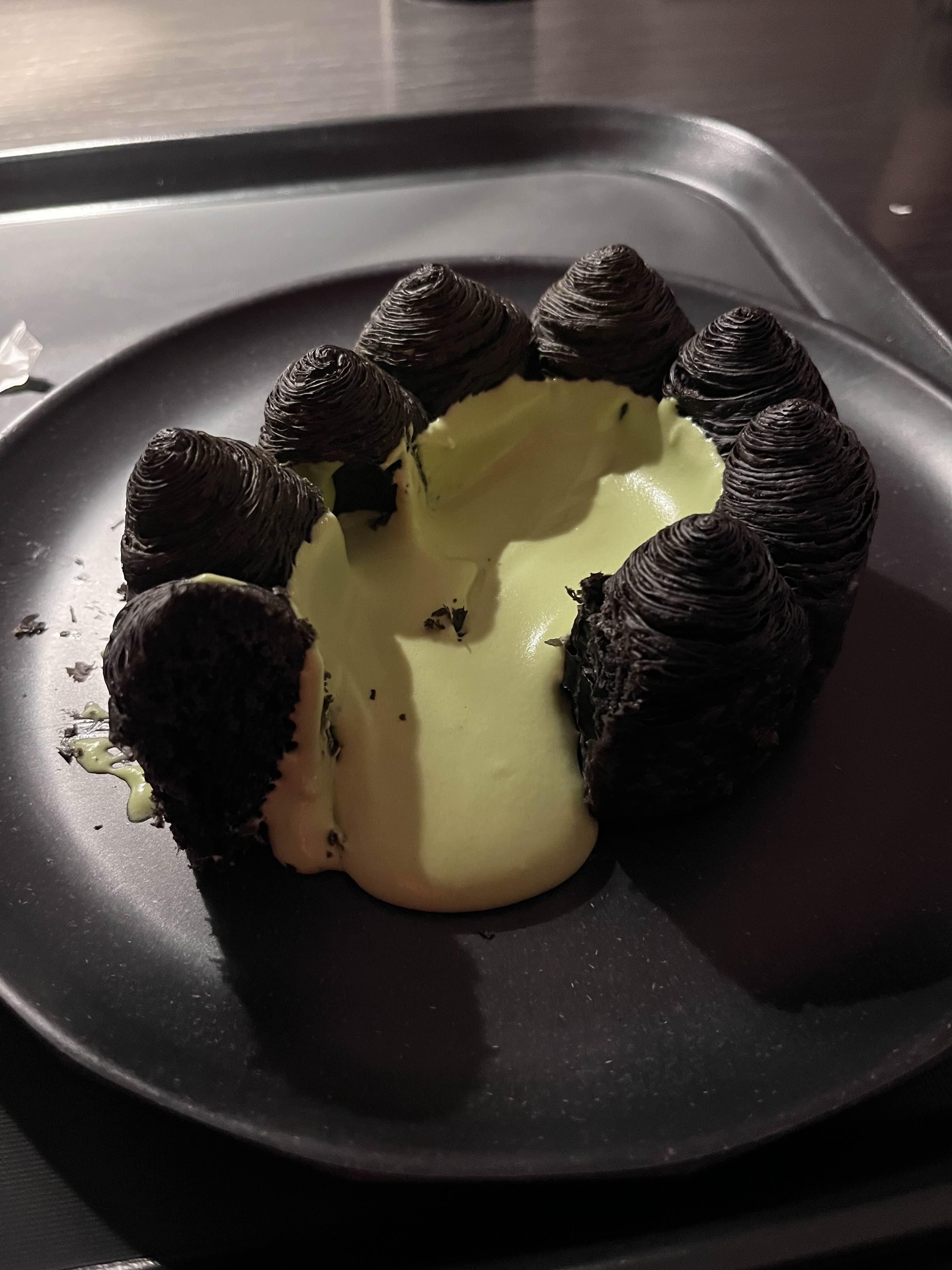 [오른쪽] 피크(PEAK) 39,000원. 제주도 성산 일출봉 느낌이 나더라고요. 누데이크를 상징하는 시그니처 케잌 중 하나라고 합니다. 조심스럽게 먹어야 합니다. 맨 아래 사진처럼 케잌의 일부를 허물면 초록색 용암이 흘러내립니다.