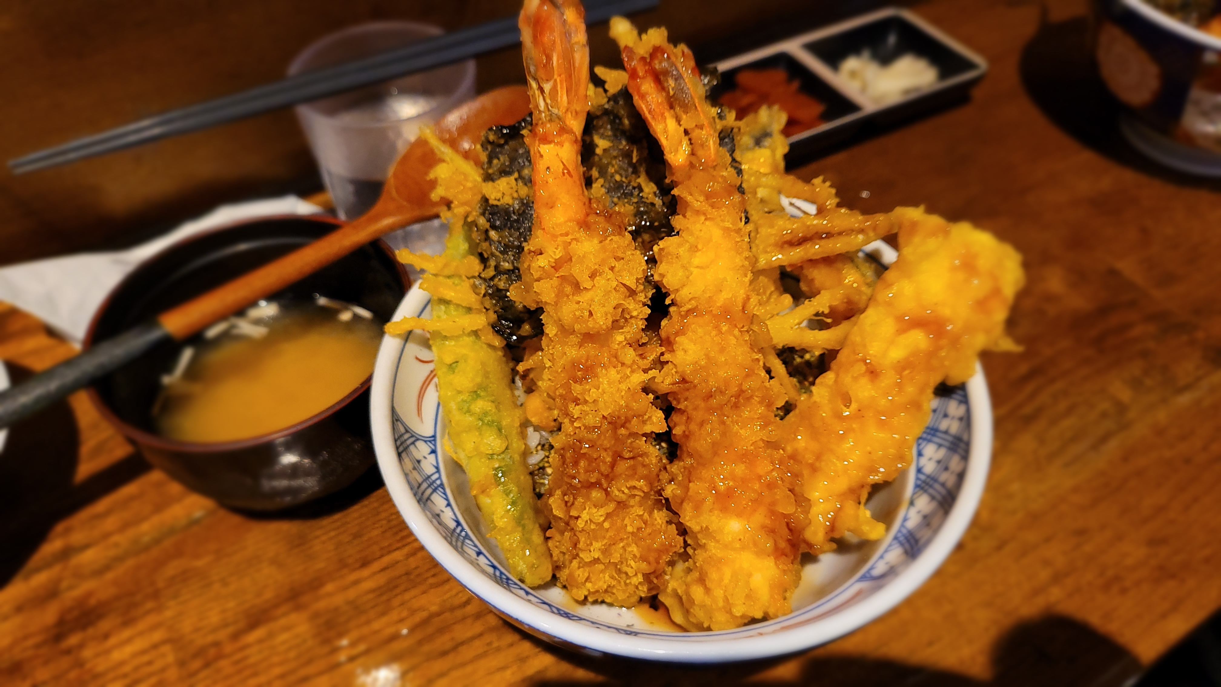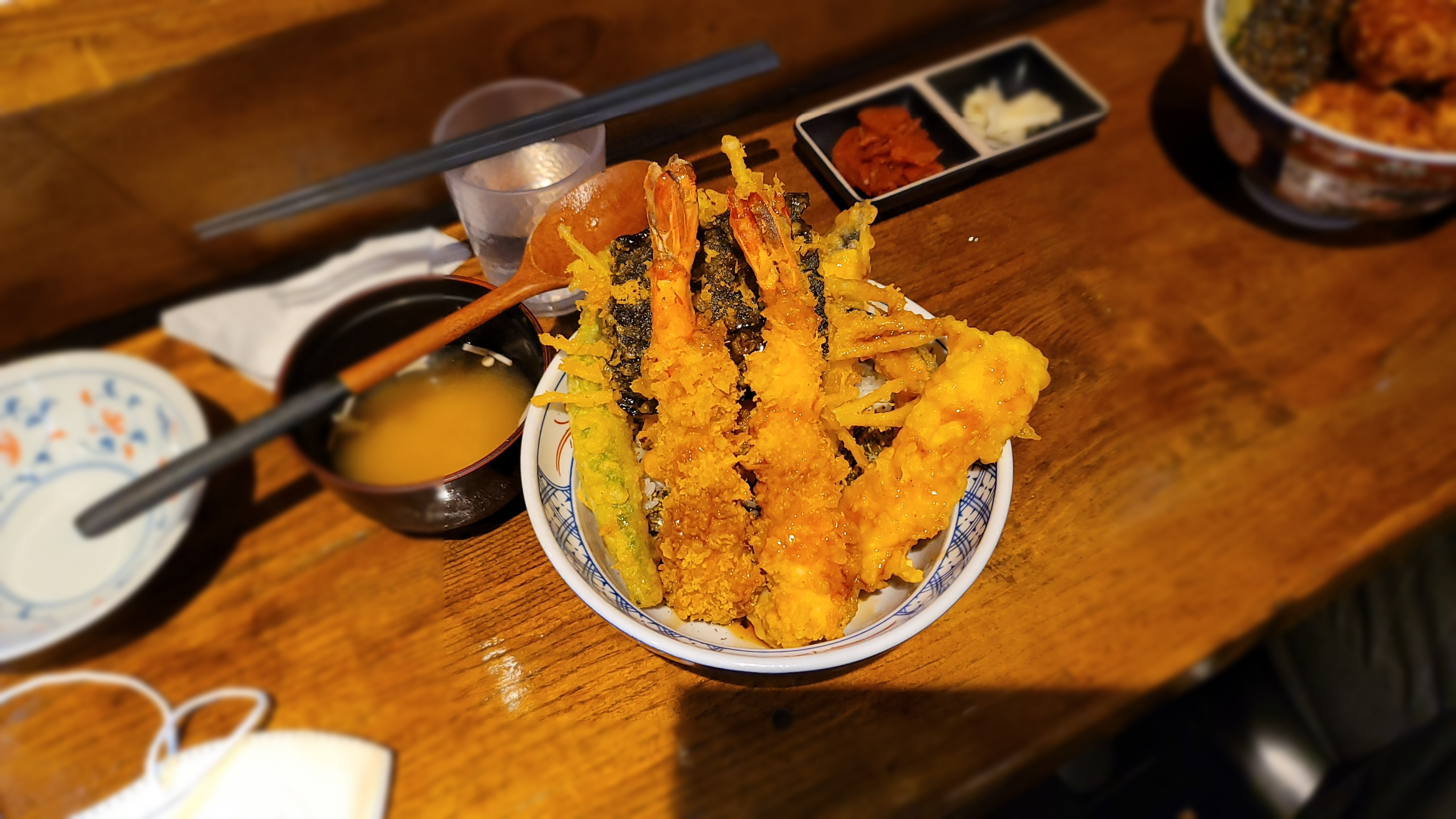 텐동은 튀김(덴뿌라)를 얹은 덮밥인데, 튀김 맛이 예술입니다. 튀김을 한 입 깨물면 입안 가득 재료의 신선함과 튀김의 아삭함이 그대로 전해지는데, 아무리 표현이 서툰 분이라도 텐동식당에서는 맛 표현을 멋지게 할 수 있지 않을까 생각합니다.