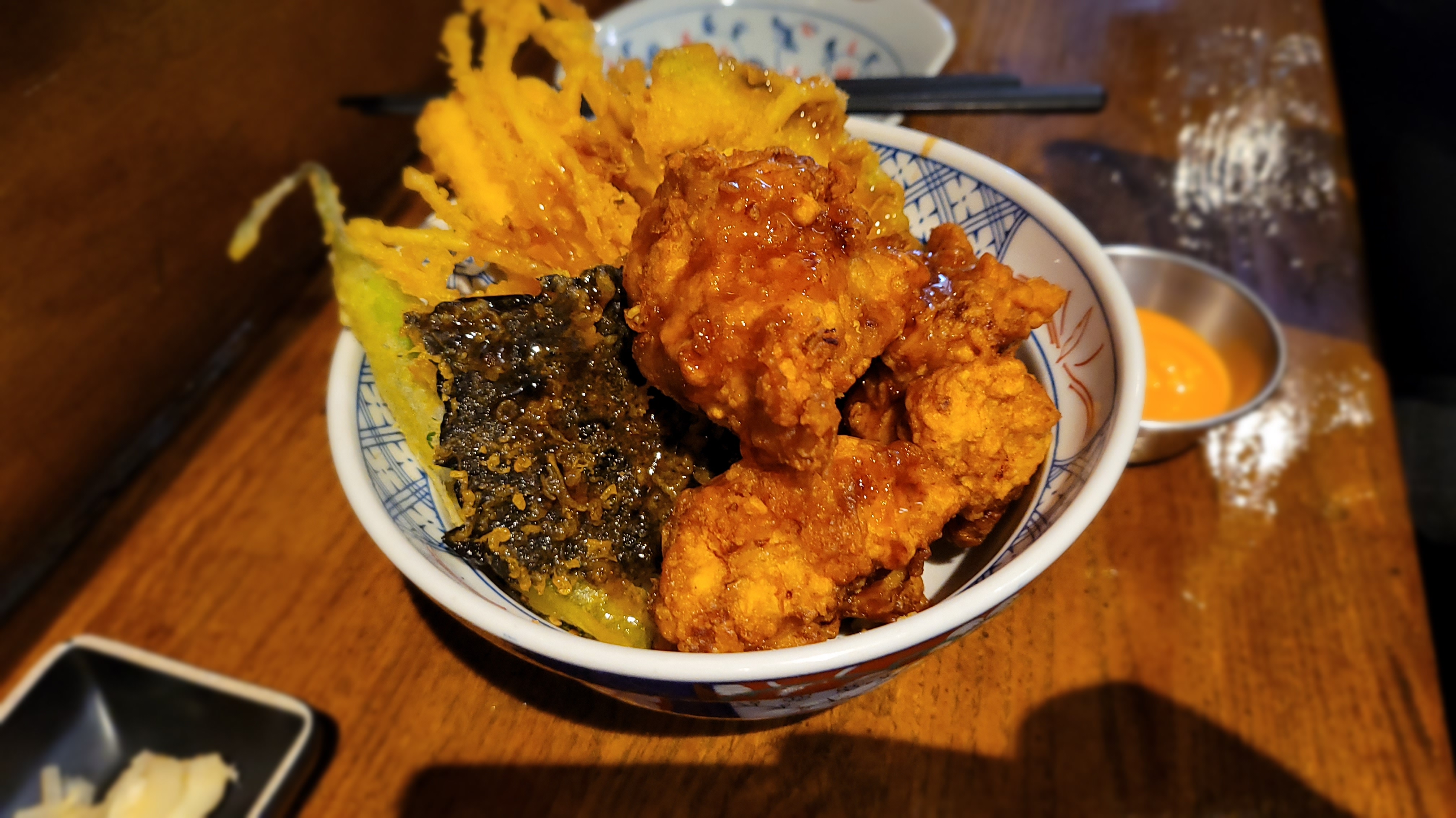 왼쪽은 제가 주문한 '이까 텐동', 오른쪽은 동료가 주문한 '치킨 가라아게동'입니다. 비주얼이 정말 예술이고, 튀김을 건져서 앞접시에 담으면 후리카케(깨알만한 크기의 양념된 작은 조각들)를 뿌린 밥이 기다리고 있습니다. 밥이 부족할 경우 더 달라고 하면 된다고 하는데요. 함께 간 분들이 다들 남성, 양이 적다는 분들은 없었습니다.