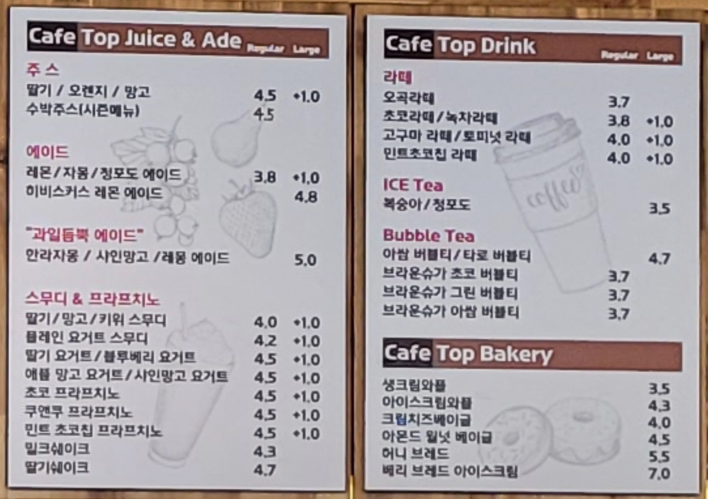 웬만한 남자들이 그렇듯 메뉴판을 자세히 본 적은 없는데요. 지금 포스팅을 하려다 보니 '아, 메뉴가 많은 곳이구나' 합니다^^;;; 다음에 날씨가 좀 풀리면 제가 좋아하는 플레인 요거트 스무디도 먹어봐야 할 것 같습니다.