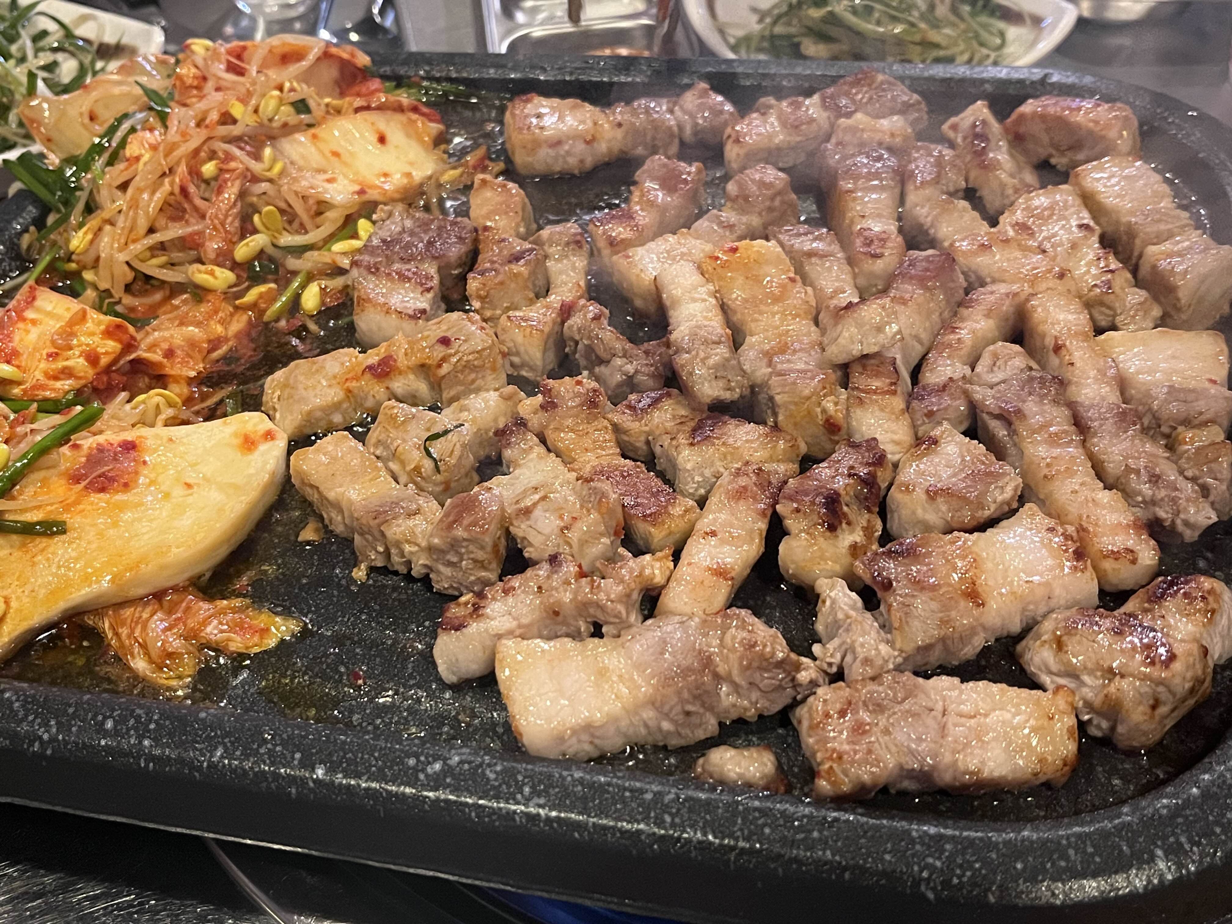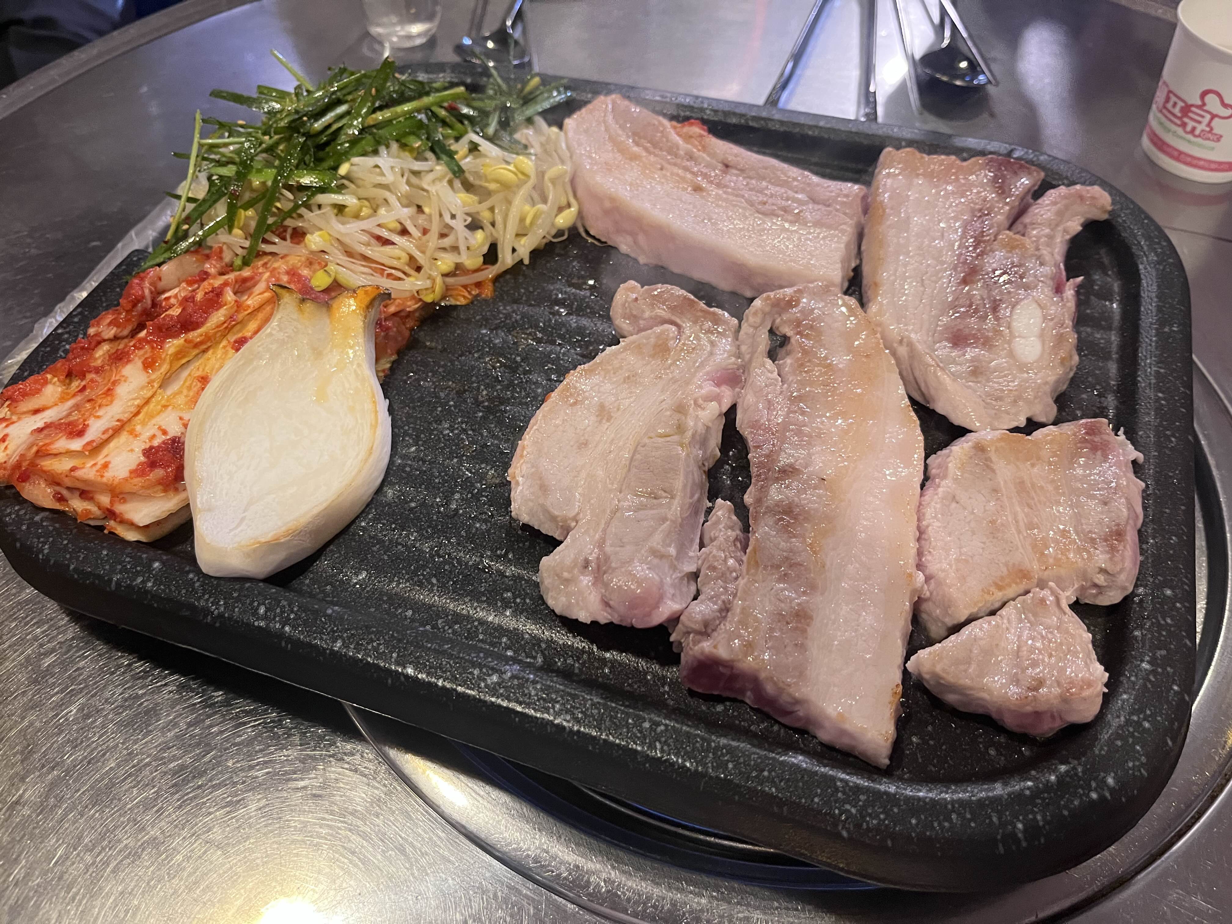 밥을 따로 안 시켰는데, 삼겸살엔 밥이죠. 공깃밥 한 숙가락 떠서 알맞게 잘라낸 삼겹살과 풍미롭게 구워진 김치 한 조각이면 밥도둑이 정말 따로 없죠~~