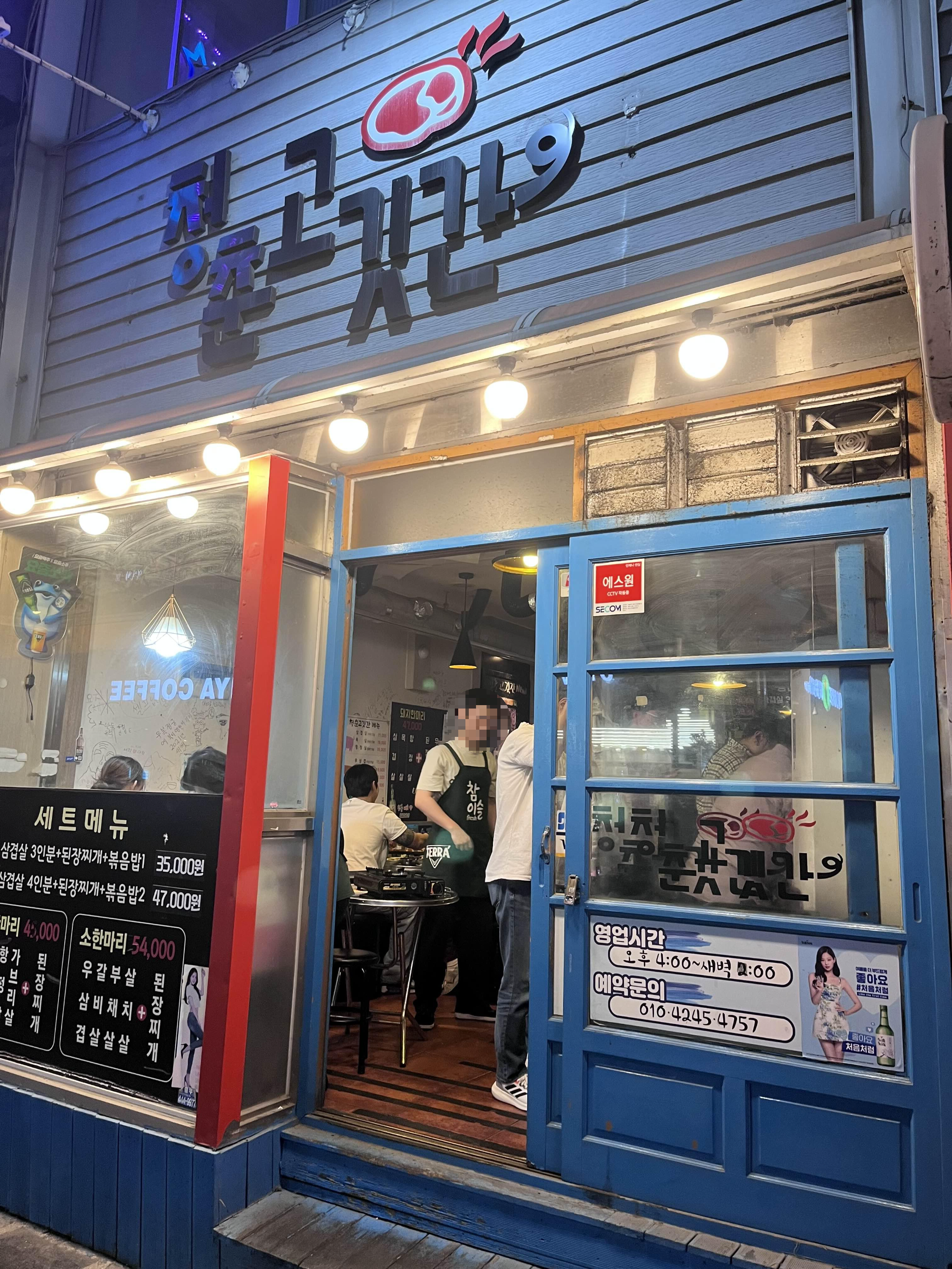 지난 금요일 회사 당구동호회 참석 후 회사 종료들과 저녁식사로 성수역 4번 출구 앞에 있는 '청춘고깃간'이라는 곳에서 저녁을 먹었습니다. 성수동 금요일 저녁이라 8명 들어갈 자리 있는 곳이 없을 텐데, 지나가다 보니 딱 자리가 있어 들어가게 되었습니다. 간판과 입구 인테리어를 보면 뭔가 레트로한 느낌이 있는데요. 십여 년 만에 찾은 당구장도 그렇고 이날은 완전 요즘 성수동의 '그것'과는 차이가 있는 컨셉이었습니다.