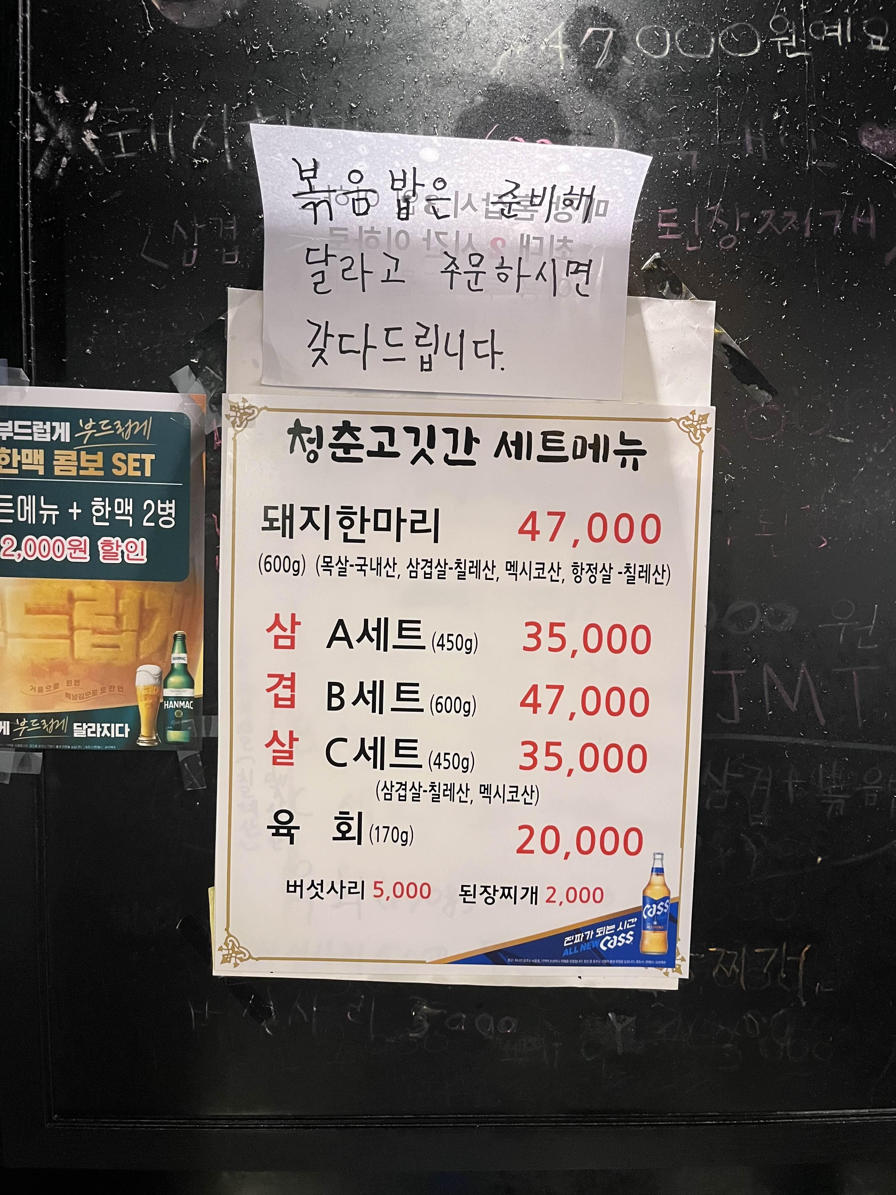 그런 면에서 이곳 청춘고깃간은 가성비가 좋기 때문에 추천드립니다^^ 이 정도 고퀄리티 삼겹살이 1인분에 12,000원도 안 하니까요.