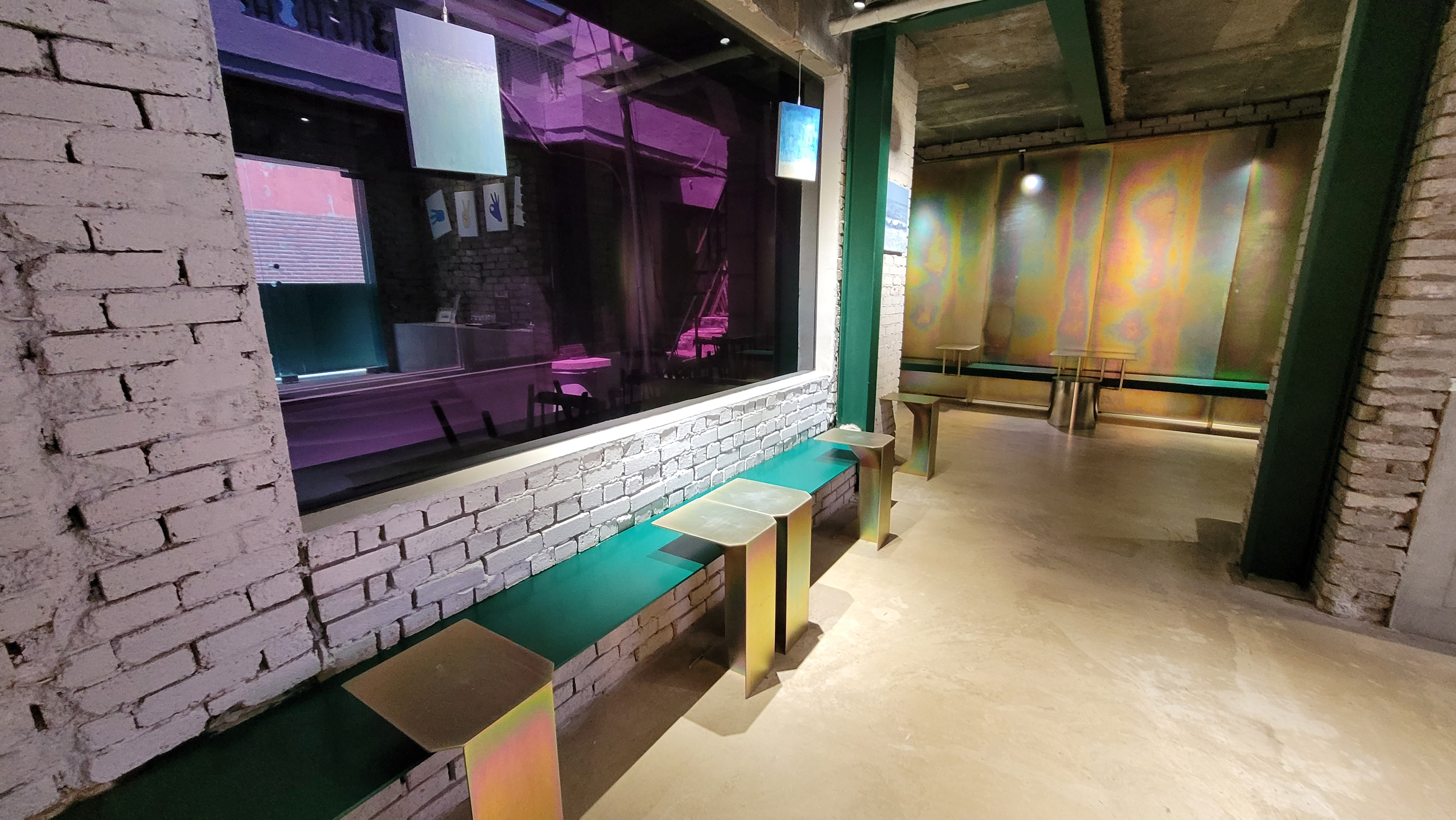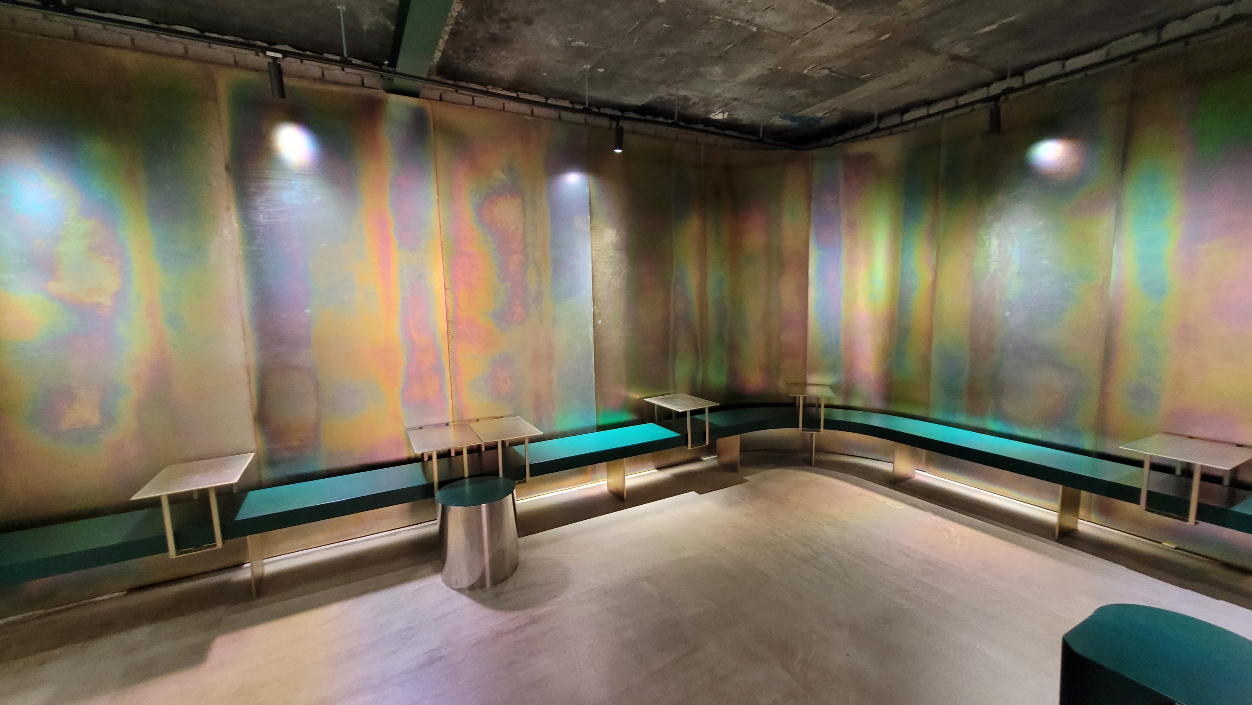 오색을 형상화한 벽체 인테리어와 테이블, 의자. 모든 것이 영업용 공간이 아니라 하나의 예술 작품처럼 보입니다.