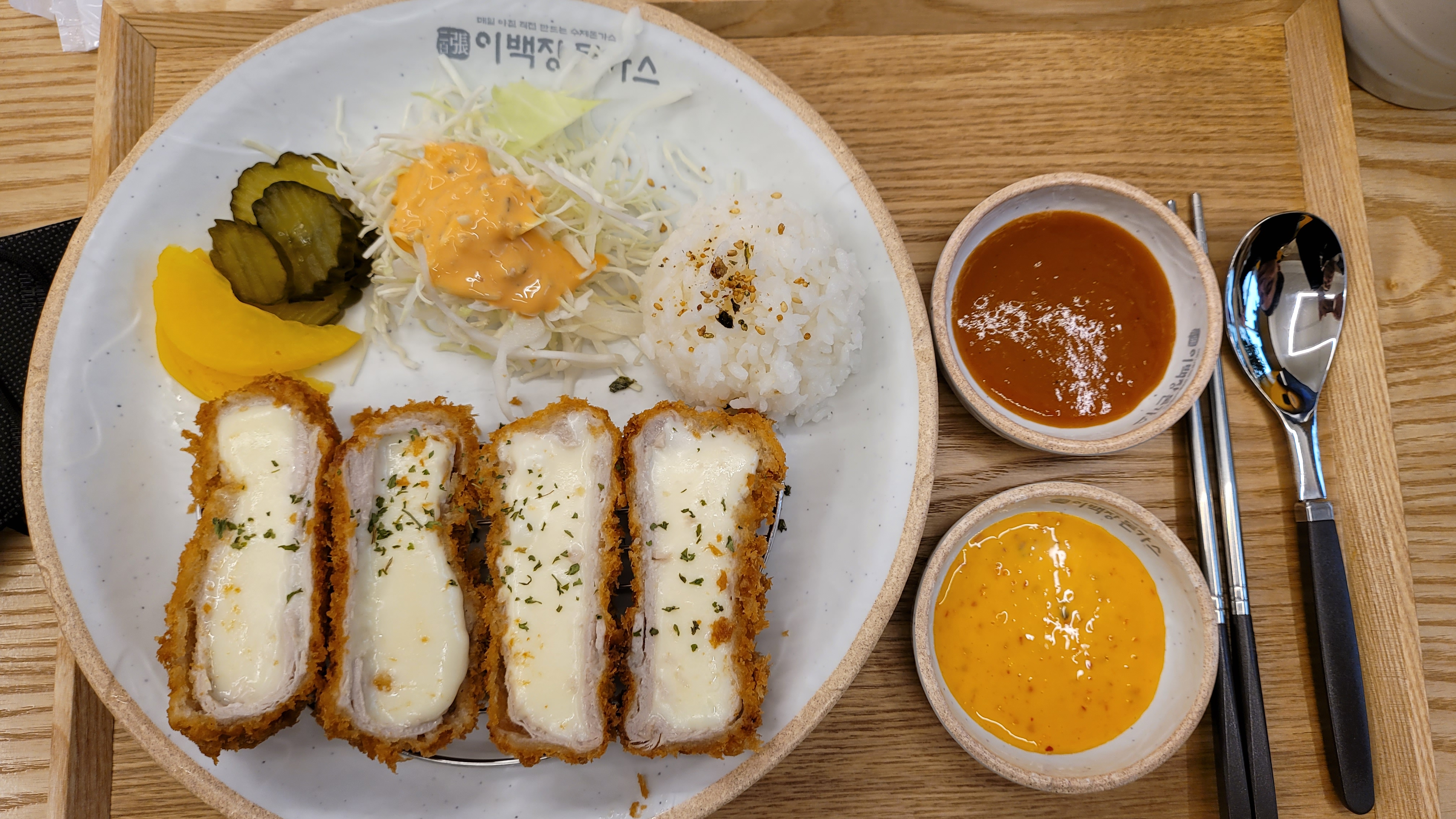 소스가 두 가지로 나왔는데, 일반 돈가스 소스에 약간 매운 시즈닝이 들어간 형태와 겨자 소스 형태의 두 가지였습니다. 이맛저맛 골고루 찍어 먹는 맛이 좋았습니다. 사실 치즈 돈가스는 어느 돈가스 집이나 맛이 비슷할 텐데, 그런 단조로운 맛을 두 가지의 소스가 차별화시켜 주는 것 같았습니다. 프랜차이즈 돈가스집이라 이런 점이 무난하죠. 그리고 단무지와 깍두기, 장국은 셀프인데 신선해서 맛이 좋았습니다. 거의 다 셀프인데 수저는 음식 나올 때 함께 나오더라고요. 한참 찾았음 ㅎㅎㅎ